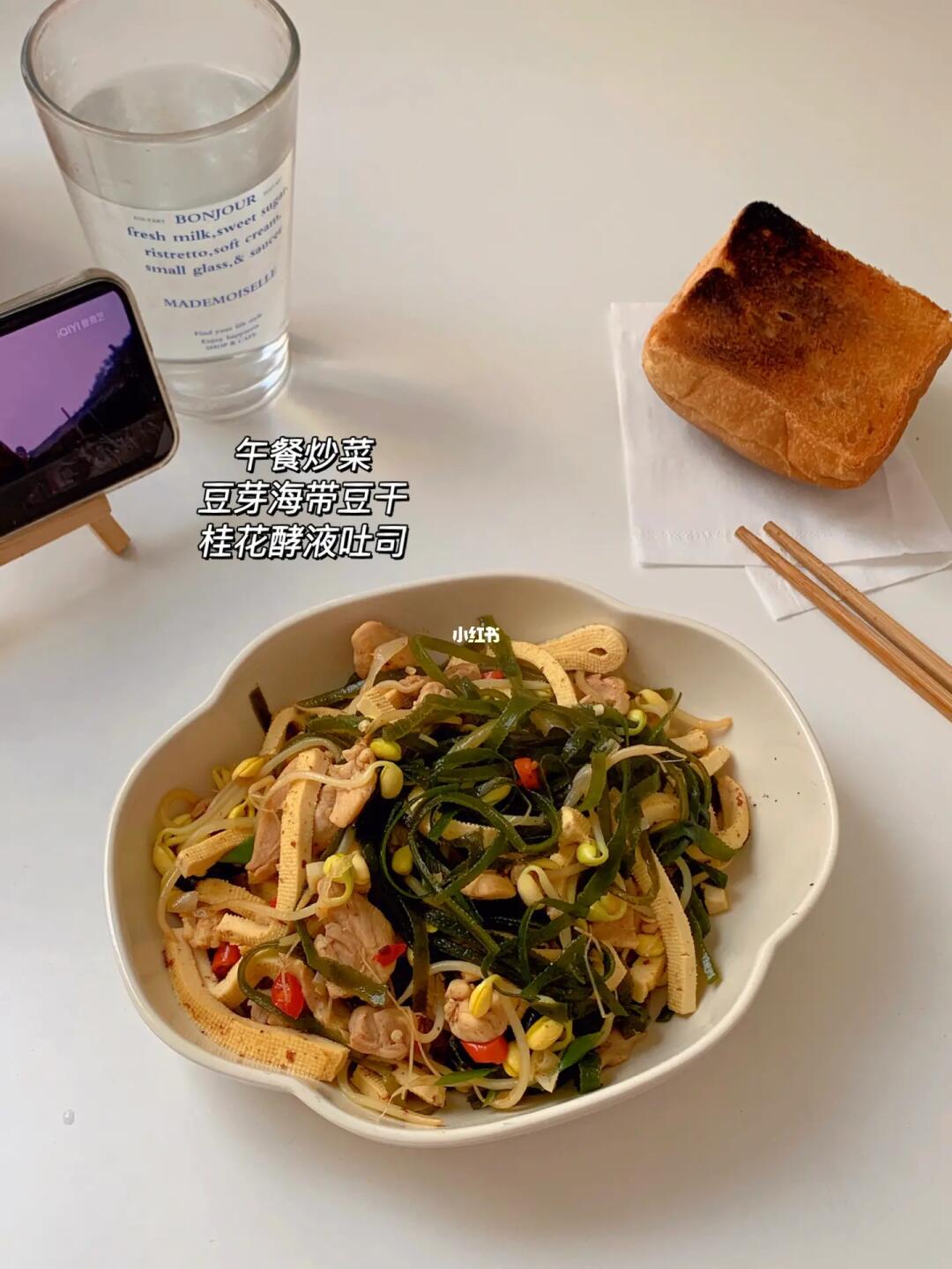 一日两餐饮食记录、好好吃饭也能瘦! 🔹初始体重:120斤 🔸现重:88(11.1称) 🔹身高:150 —— 🥯早餐:贝果奶酪|黑咖啡☕|西蓝花🥦|红椒煎蛋|苹果🍎 🥣午餐:鸡腿肉炒豆干海带|桂花吐司 🥣下午茶:拿破仑➕饼子 💧今天喝水2000ml➕ —— 即使没人欣赏也要自己欣赏自己,没人观看也在认真生活认真分享着~