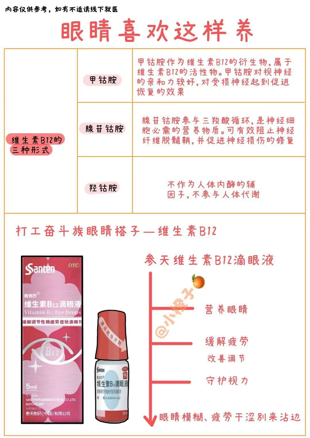 [红色心形R]补充营养:维生素B12是神经系统功能健全不可缺少的维生素,是参与神经组织中一种脂蛋白的成分。其中甲钴胺做为维生素B12的衍生物,对视神经的亲和力友好,是神经细胞的营养物质。眼睛模糊不适,可能就是调节力下降引起了视疲劳啦[哭惹R]如果不重视,还容易导致近视度数加深[捂脸R]