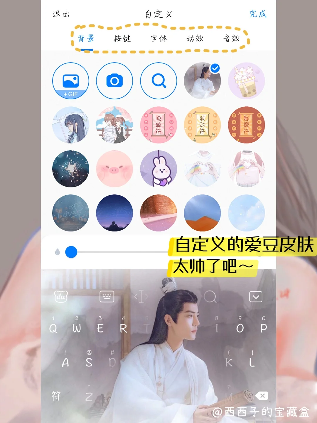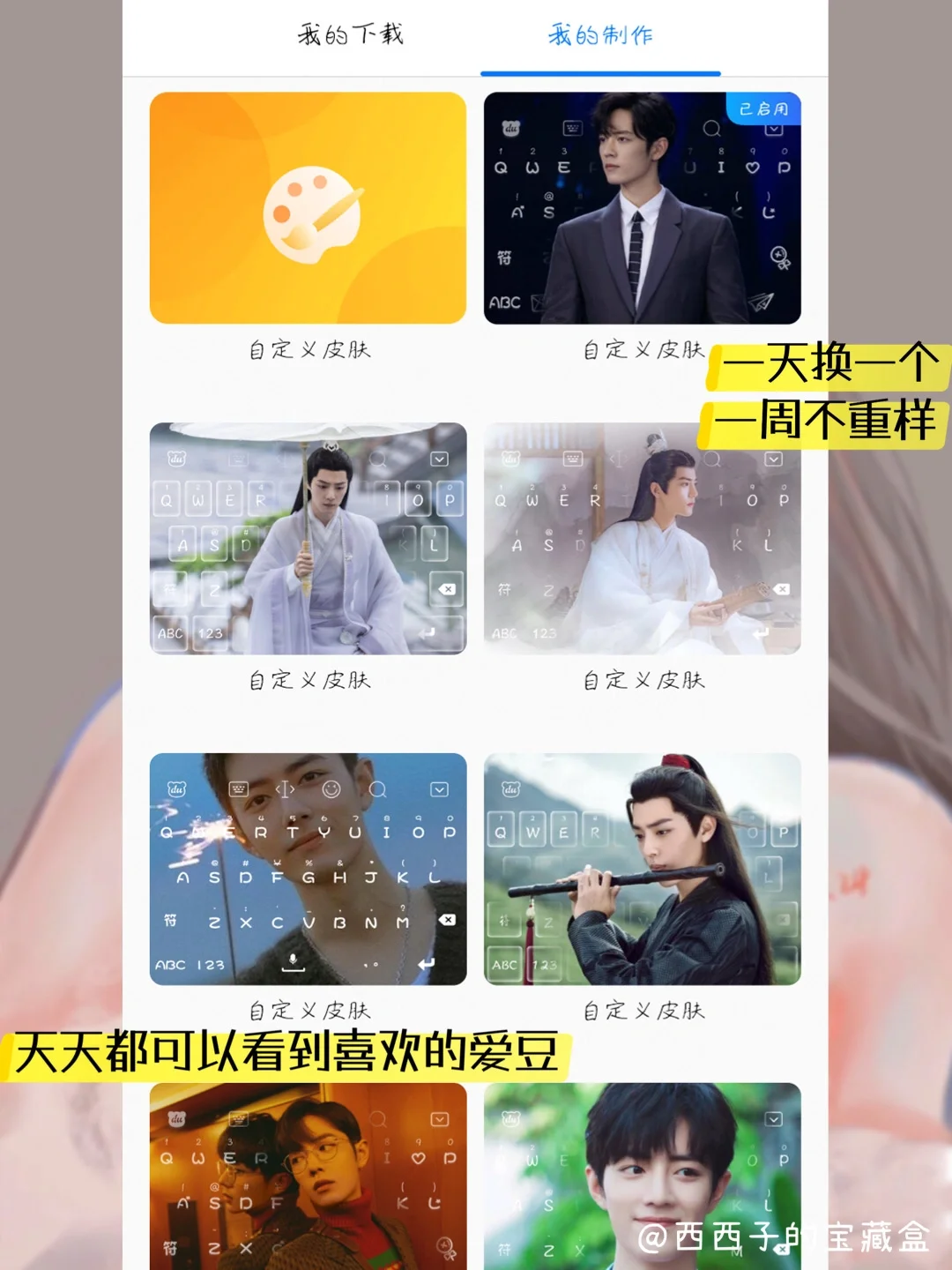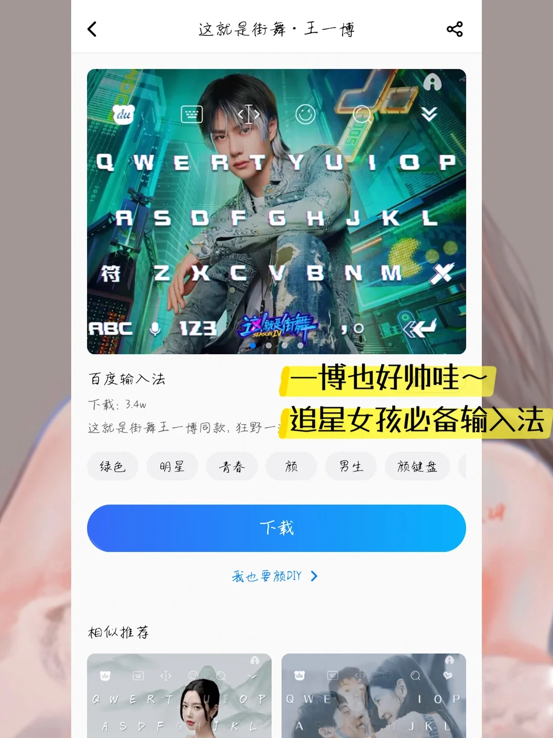 APP名称👉《百度输入法》 支持👉iOS/安卓 · 🌟滴滴滴,追星女孩集合啦~ 🌝想跟你们秀一下我DIY的爱豆的输入法皮肤,是不是超帅? 哥哥的颜真的是绝绝子,把他牢牢焊s在我的聊天桌面,❤️也太满足了,哈哈哈~ 从背景图到字体,[赞R]这个APP都支持自由DIY,我们可以大胆的去制作独一无二的[飞吻R]爱豆输入法皮肤。 还有一些其他适合追星的功能,我都给大家出来了,[斜眼R]姐妹快冲冲~ · 🌟追星必备: ❤️「爱豆输入法皮肤」 [萌萌哒R]进了爱豆广场,我差点出不来,里面全是明星爱豆的输入法皮肤,[黄金薯R]还有一些热剧CP的皮肤,高清可以免费用,也可以自己去DIY爱豆皮肤,[doge]这个上面也有说到啦~ ❤️「追星表情包」 这个必须要有‼️ 直接搜🔍爱豆的名字,你就能拥有一堆爱豆表情包,搜剧名就会有剧情表情包,打开神句配图功能,聊天的时候发表情包速度贼快![萌萌哒R]嘻嘻~ ❤️「爱豆手写字体」 爱豆手写的✍️原创字体哦~可以免费用,💔遗憾的就是没有我们哥哥的,[派对R]姐妹们可以看看有没有你们爱豆的~ 如果没有,👉也可以Ai创作自己的原创字体!