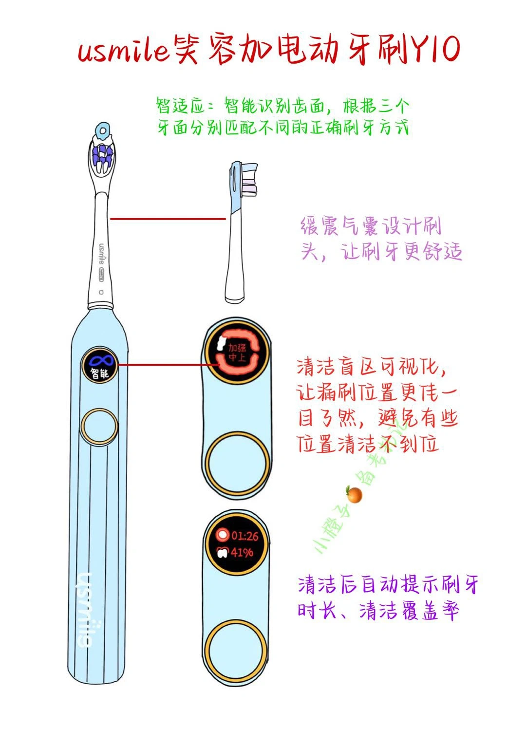 所以我选择了不需要任何手法跟技巧就能刷干净牙齿的usmile笑容加电动牙刷(Y10),小橙子很喜欢它的智能性,可以自动识别齿面,无论是内侧、外侧还是咬合面都能匹配不同的正确刷牙方式,刷牙后还有智能屏反馈刷牙时长和漏刷区域,每天轻轻松松就把牙齿刷得干干净净!真的棒棒哒,跟蛀牙说拜拜啦!!
