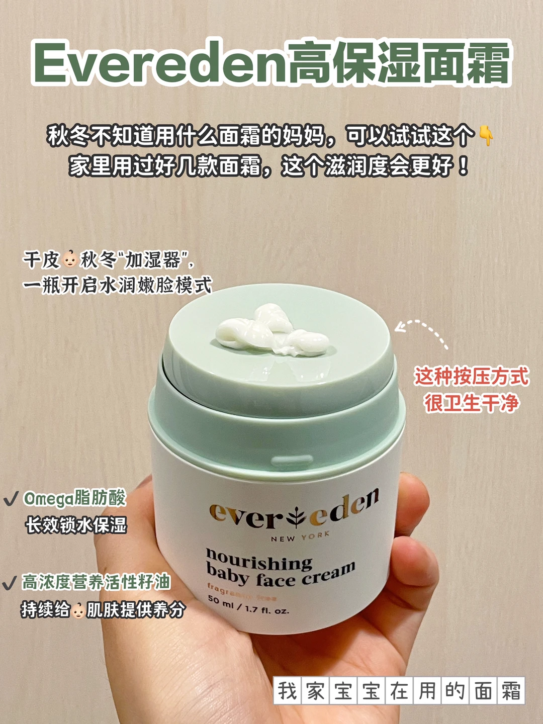 7️⃣抹上婴儿面霜,及时保湿,建议在皮肤👉有点湿润的状态下涂抹会更好,秋冬真心推荐用🔹Evereden高保湿面霜!这个是皮肤科👩妈妈研发的,天然植物基底,非常温和,新生儿可以安心用。和别的面霜不一样,它里面含有Omega脂肪酸和高浓度的营养活性籽油,相当于干皮宝宝的“加湿器”。🍁在秋冬干燥的环境下,也能持续给宝宝的肌肤提供营养和水分,让宝宝的皮肤更加水嫩稳定,不闹小情绪。虽然是比较厚的奶霜质地,但吸收很快,不觉得黏腻,就像在皮肤上留下一层保护膜一样,小脸水水润润的。最近北风飕飕吹,我家宝宝都没怎么干燥起皮过~