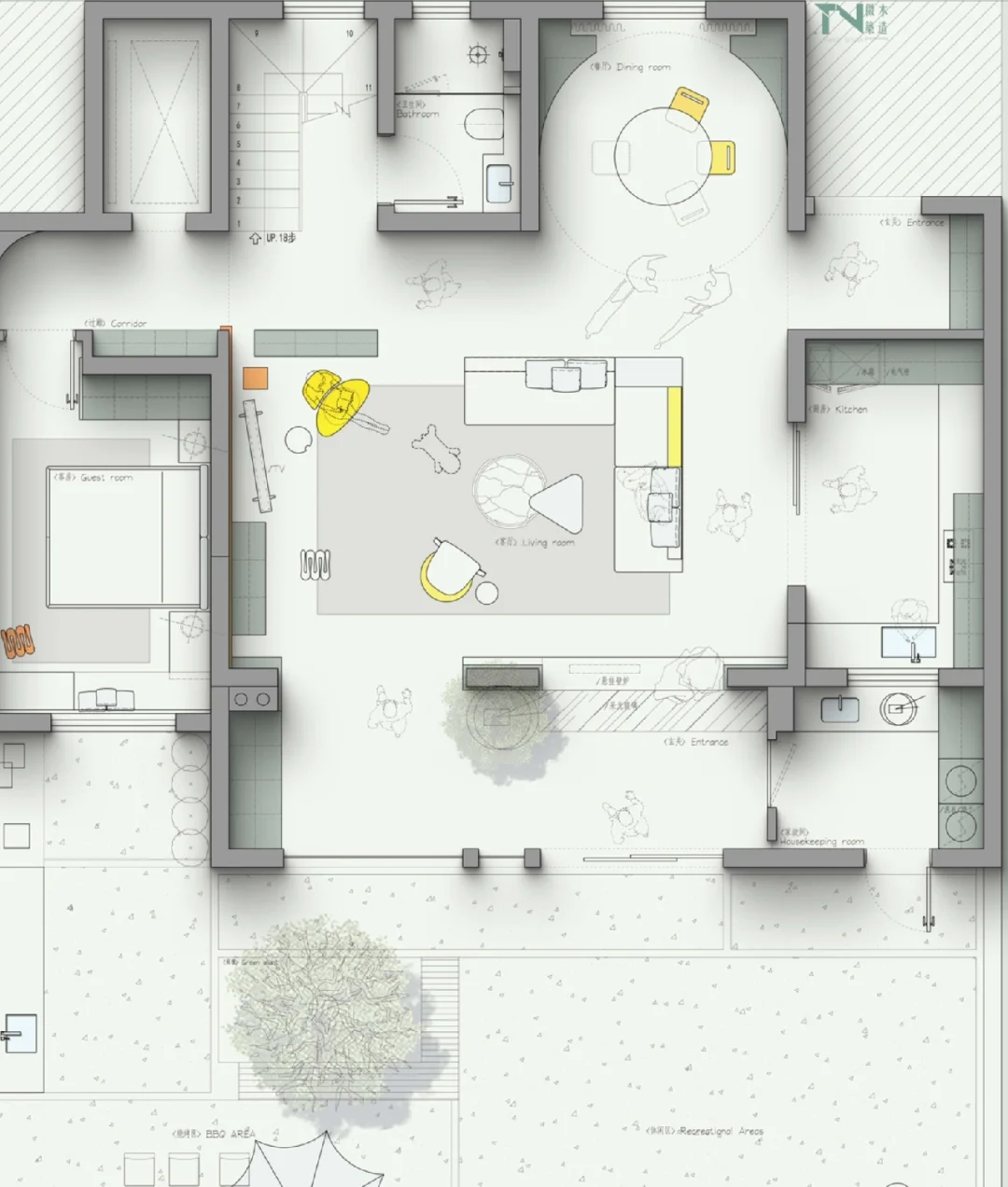 设计需求: 一层: 父母房、厨房(橱柜已做好)、餐厅(可以用圆桌) 要做采光井(地下室采光) 二层: 两间孩子房、主卧套间(衣帽间、健身区、茶歇区) 卫生间精装不打算改造 地下一层: 保姆房、大的衣帽间 地下二层: 地下室玄关(大鞋柜)、茶区、家庭影院