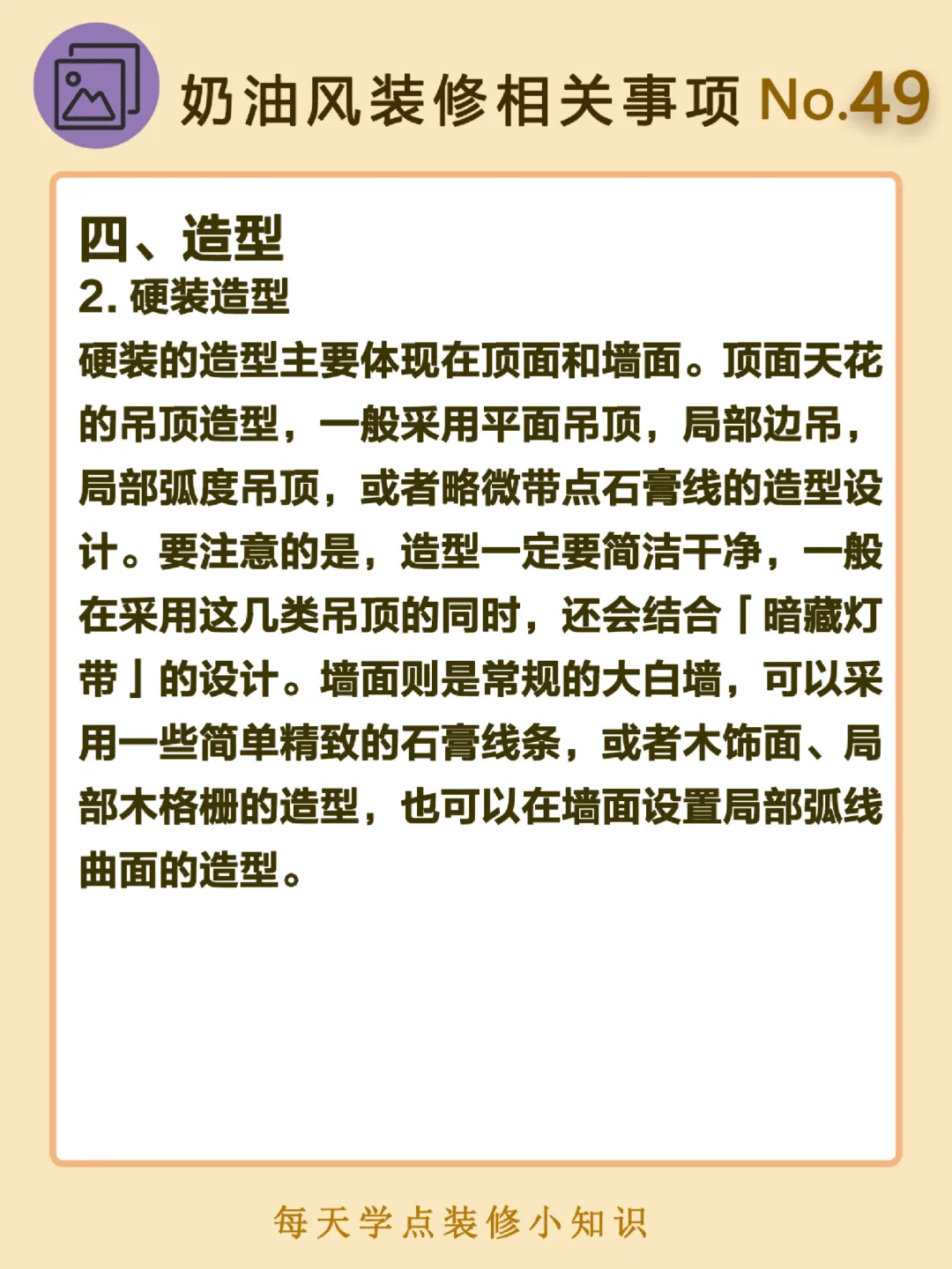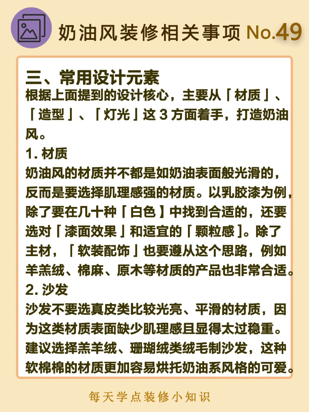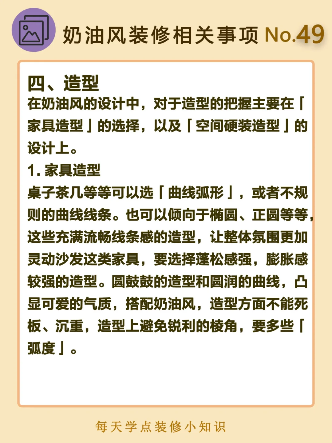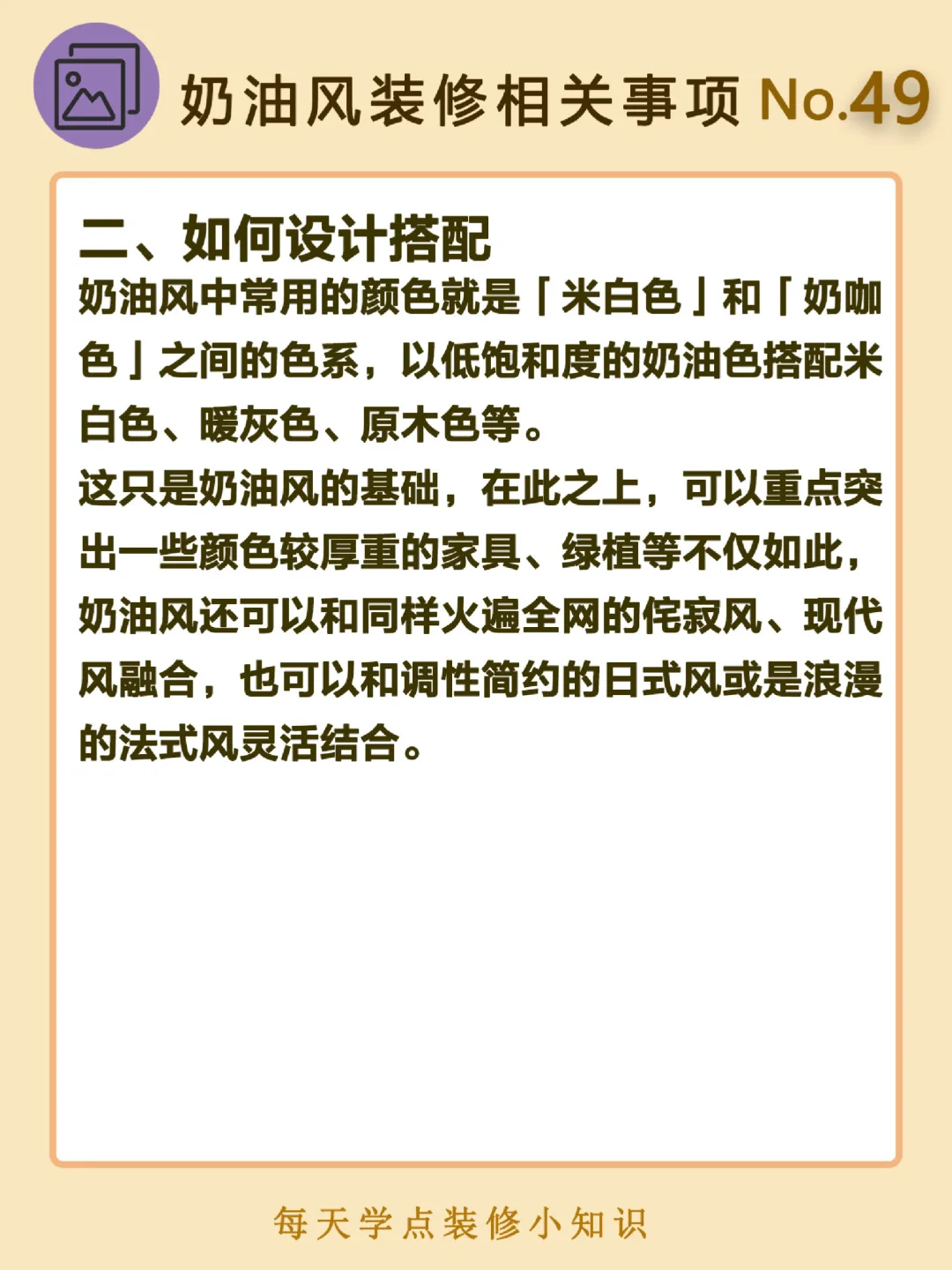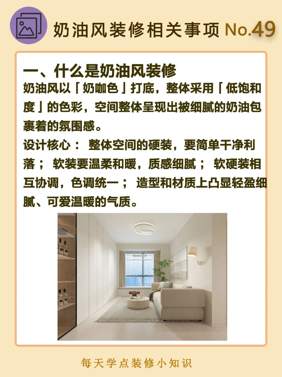奶油风以[奶咖色,打底,整体采用,低饱和度]的色彩,空间整体呈现出被细腻的奶油包裹着的氛围感。设计核心 : 整体空间的硬装,要简单干净利落 ; 软装要温柔和暖,质感细腻 ; 软硬装相互协调,色调统一; 造型和材质上凸显轻盈细腻、可爱温暖的气质。