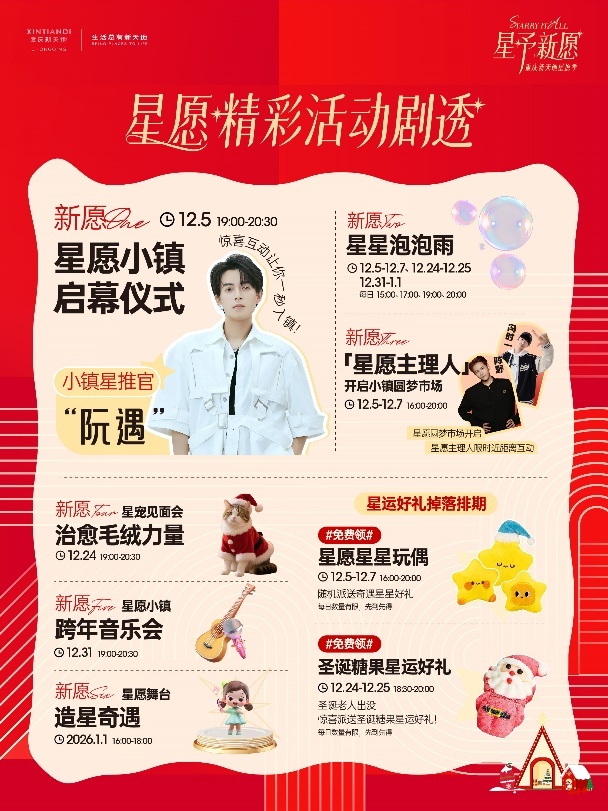 嘉陵江畔惊现18米“穿楼圣诞树”,超大星愿小镇一夜刷屏当冬季的第一阵江风吹过渝中半岛,“一棵”穿楼而出的圣诞树点亮江畔夜空——重庆新天地以“星运祈愿树”和超大“星愿小镇”为双重视觉主角,正式开“星予新愿——重庆新天地星愿季”,用一整季星光与温度,陪伴市民度过这个冬日假日季。12月5日晚,“星愿季启幕”亮灯仪式在滨江广场拉开序幕。星推官“阮遇”与艺术家董洪龙先生,在星光与泡泡雨的氛围中,与现场观众共同见证点亮时刻,星光在江面与建筑立面之间流动,为今年的星愿季按下“开机键”。期间,“圆梦市场”集结多家原创独立品牌及特色文创,让沿江夜晚多了一份热乎手的烟火气。市民可以一边逛市集、一边在同角落打卡,完成一场从视觉到味觉的冬夜漫游。“萌星市集”则让孩子们成为真正的“小星星人”:小朋友身着星星元素服饰,带上玩具来到小镇交换分享,在互动中结识新朋友、收获新故事。同时,“天地新引力·年终会员节”同步开启:围绕餐饮、零售等业态,推出满千返百、团购礼遇、限时秒杀及会员6大礼遇等多重活动,让大家在被美陈吸引打卡的同时,也能享受到切实的年终消费惊喜。 重庆·重庆新天地