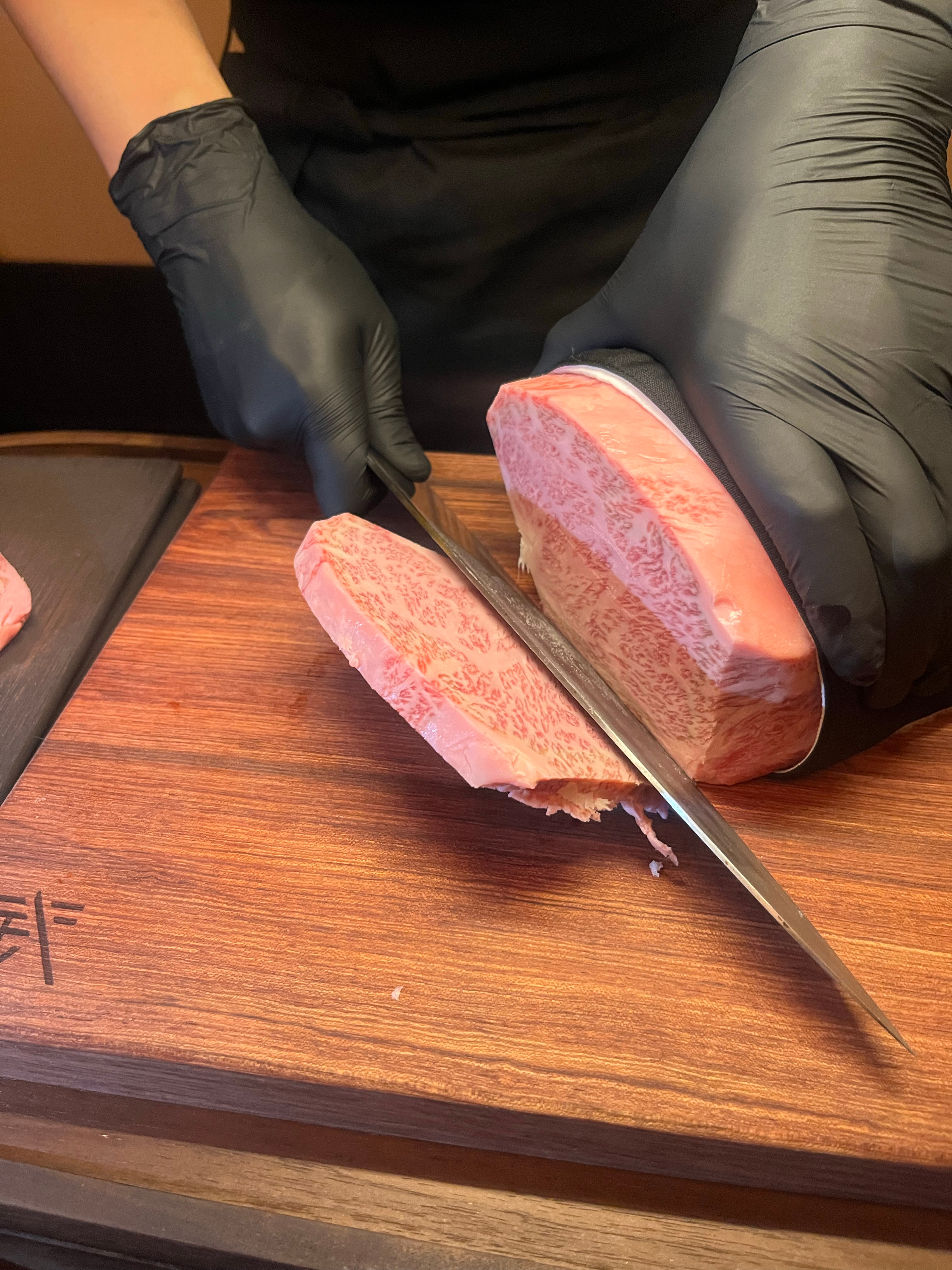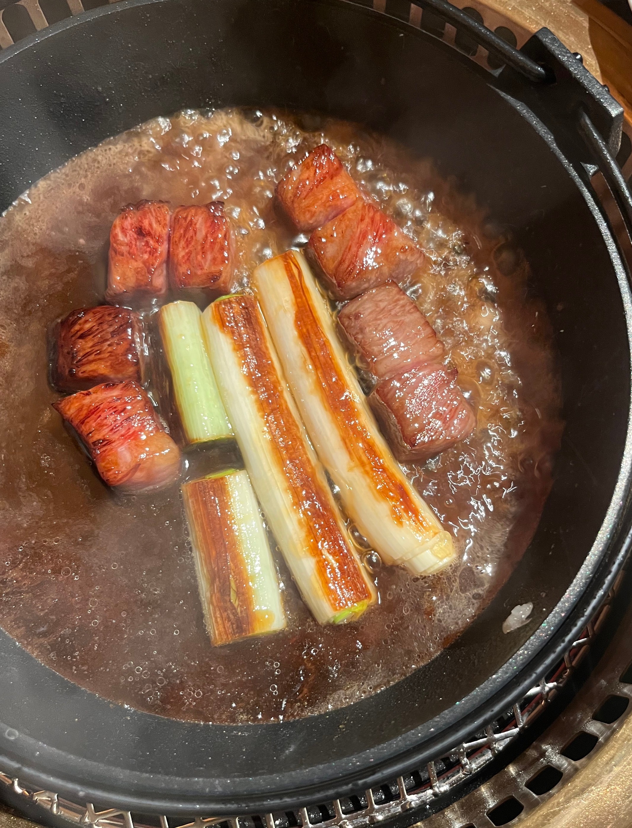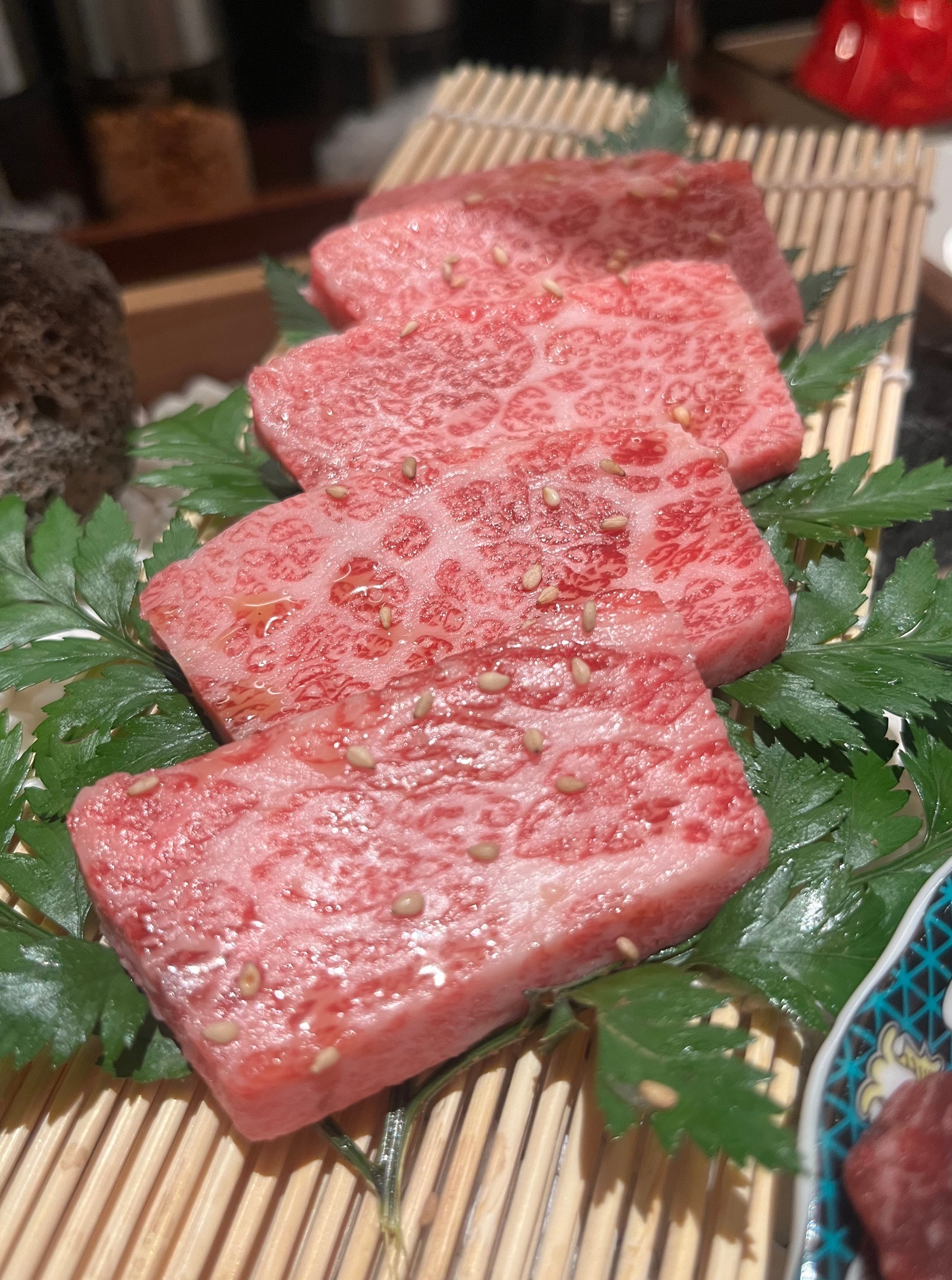 武士的牛·琥珀之宴🐮先付和风餐具一击即中少女心,开启一餐的烟火雅韵。熟成鲷鱼油脂丰盈,于生吃口感又是另一番风景。澳洲RV牧场500天育成纯血和牛次第上桌,西冷,牛小排,横膈膜…恰到火侯的炙烤,唤醒天然的脂香和甘甜。此时来上一盏清爽的杏皮水承上启下。再来,再来。厚切牛舌,堂烹鹅肝,板腱薄切…每一口都风姿绰约,浓、脆、嫩、香,各展不同部位的芳华。连收尾菜寿喜锅,都“奢侈”的以和牛骰子代替常规肥牛卷,便知这餐的高规格。我搅拌了这添香的蛋液,蘸滚烫多汁的牛肉粒,一口咬下时,感觉爆浆得薛微有一点点的超纲。末了,以一盅柚子雪葩划下完美ending 。起立,鼓掌👏琥珀之美,美在经历时光淬炼后的沉淀,一如品牌经历7年打磨后,静心呈现的琥珀之宴。感谢款待,武士的牛。 重庆·武士的牛(光环店)