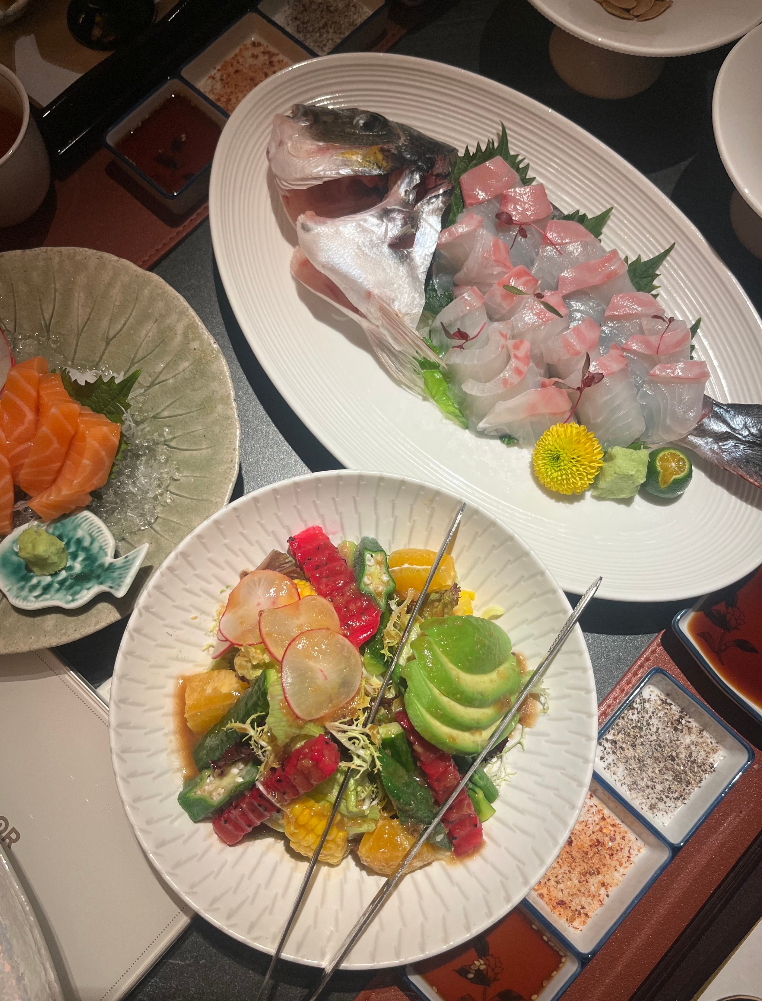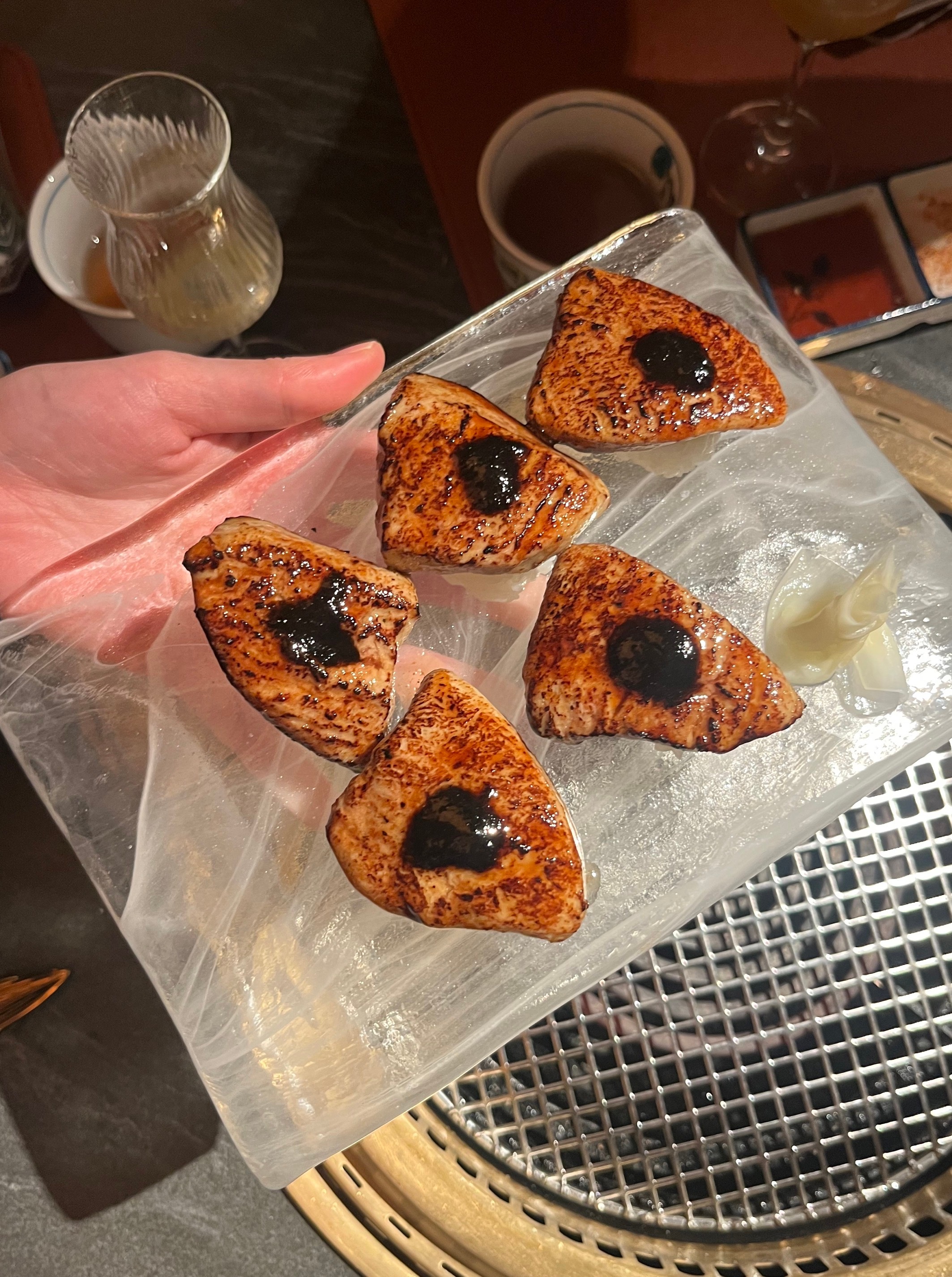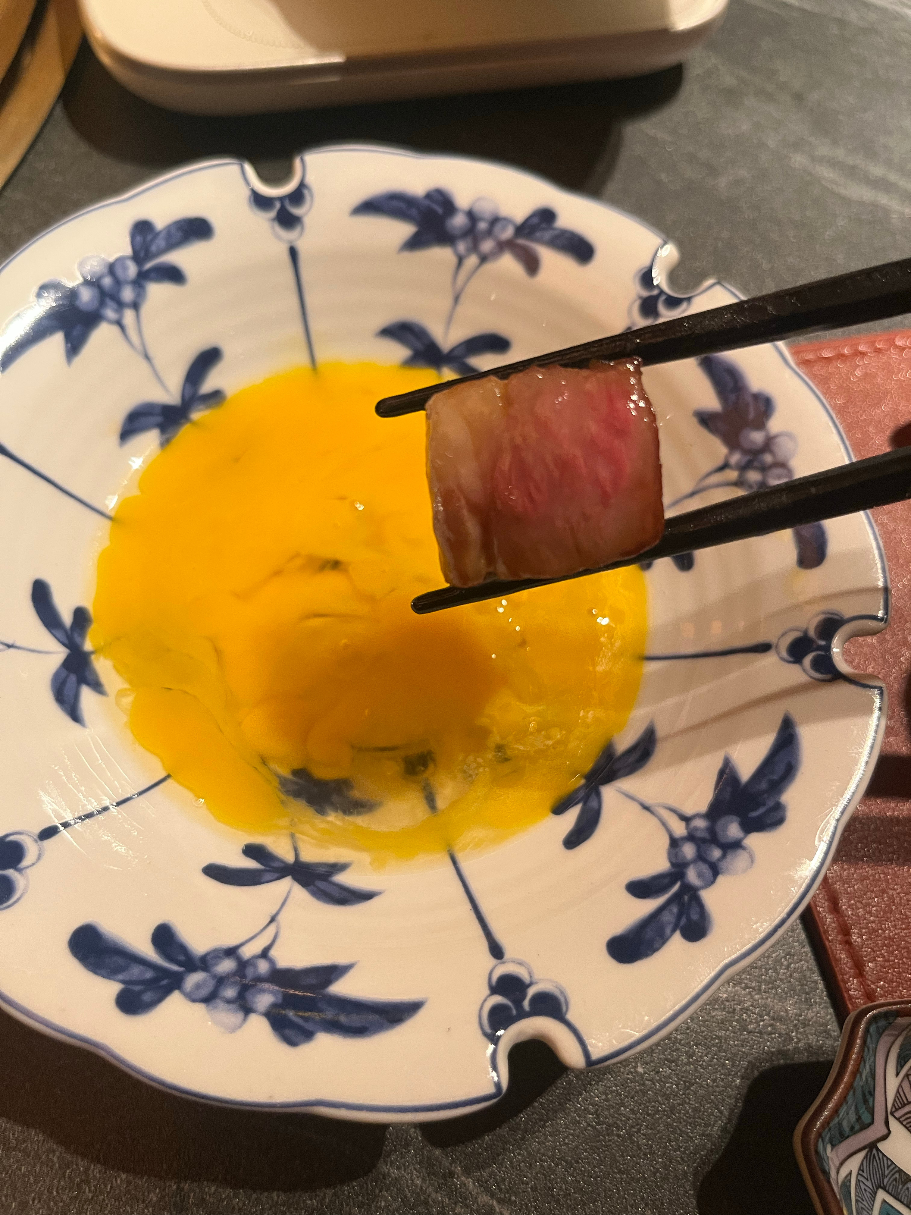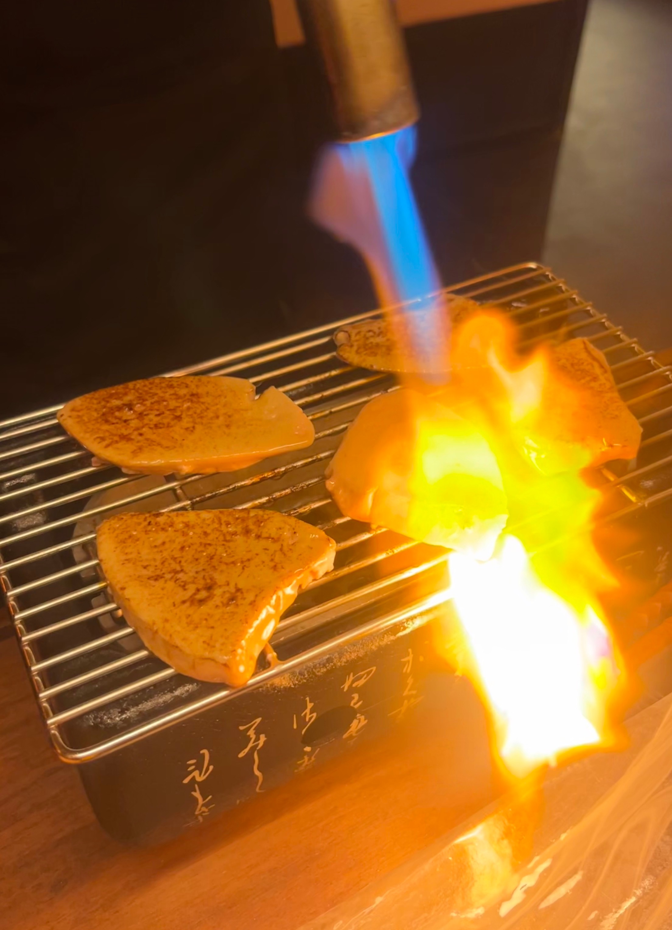 武士的牛·琥珀之宴🐮先付和风餐具一击即中少女心,开启一餐的烟火雅韵。熟成鲷鱼油脂丰盈,于生吃口感又是另一番风景。澳洲RV牧场500天育成纯血和牛次第上桌,西冷,牛小排,横膈膜…恰到火侯的炙烤,唤醒天然的脂香和甘甜。此时来上一盏清爽的杏皮水承上启下。再来,再来。厚切牛舌,堂烹鹅肝,板腱薄切…每一口都风姿绰约,浓、脆、嫩、香,各展不同部位的芳华。连收尾菜寿喜锅,都“奢侈”的以和牛骰子代替常规肥牛卷,便知这餐的高规格。我搅拌了这添香的蛋液,蘸滚烫多汁的牛肉粒,一口咬下时,感觉爆浆得薛微有一点点的超纲。末了,以一盅柚子雪葩划下完美ending 。起立,鼓掌👏琥珀之美,美在经历时光淬炼后的沉淀,一如品牌经历7年打磨后,静心呈现的琥珀之宴。感谢款待,武士的牛。 重庆·武士的牛(光环店)