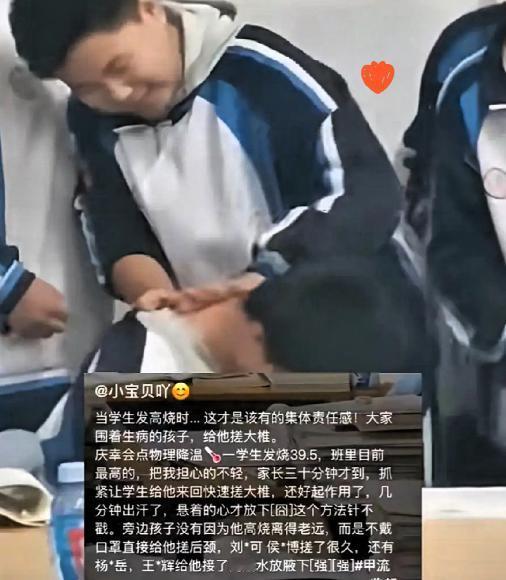 看哭了!山东,一男生在教室突然高烧39.5度,家长半小时才能到校,没想到,同学疯狂给他搓大椎穴发汗退热,这一幕将老师感动得泪流满面! 家长冲进山东德州某高中三楼教室时,看到的是满屋子忙碌的身影:两个男生额头沾着汗,正对着自家孩子的后颈不停揉搓。 旁边有同学捧着热水瓶护在腋下,还有人拿着纸巾轻轻擦拭孩子额头的虚汗。 而此时,距离老师拨通求救电话,刚好过去半小时。 时间回溯到半个小时前,班里有五名同学因流感请假,趴在桌上的男生突发高烧,39.5℃的体温计读数,让刚下课的教室瞬间陷入紧张。 “我出汗了,头疼好多了。”这是发烧男生在被揉搓七八分钟后说出的第一句话。 搓他后颈的是刘某某和侯某某,两人轮流上阵,力道大到后颈皮肤发红发亮,自己的手掌也酸得抬不起来。 后来有人科普,他们搓的大椎穴是中医退热要穴,这群没经过专业培训的孩子,竟用最朴素的方法找对了关键。 老师的心情比谁都复杂。 她刚测完体温就给家长打了电话,得知对方在郊区办事,最少半小时才能赶到,转身想叫医务室人员时,教室里已经自发形成了救援小队。 有人跑去饮水机接热水灌进矿泉水瓶,有人顺手拉开发烧同学的外套拉链透气,还有女生在旁边轻声安抚,没人提“甲流传染”这回事。 这段场景被老师拍成视频传到网上后,评论区分成了两派。 有人直呼 “破防”:“在甲流高发期,孩子们不顾传染风险出手相助,没有成年人的权衡利弊,只有纯粹的善意,这才是青春该有的样子!” 还有网友点赞应急智慧:“没想到高中生还懂搓大椎穴退热,生物课知识 + 生活经验学以致用,太赞了!” 质疑声同样存在:“近距离接触不戴口罩,虽感动但风险不小,学校该加强防疫引导和应急培训。” 还有网友共情现实困境:“双职工家长太难了,孩子突发高烧根本赶不及,还好有暖心同学兜底,也希望学校能完善应急机制。” 另有网友感慨:“对比成人世界的功利,少年人的情谊更显珍贵,这份善良值得守护。” 面对质疑,老师给出了解释:学校一直倡导戴口罩,但部分学生觉得闷,不愿配合,学校没有强制权力,只能反复提醒。 她坦言自己当时确实忐忑,孩子高烧不退,家长未到,万一出意外谁都担不起责任,还好同学们的善意化解了危机。 后续消息显示,发烧男生只是流感引发的高烧,经医院治疗后很快康复返校。 而这场半小时的救援,也折射出当下校园的普遍困境:入冬后流感、支原体肺炎高发,密闭教室成了交叉感染重灾区,不少班级出现“半班请假”。 双职工家长工作繁忙,孩子突发紧急情况时,往往难以及时赶到。 后来医生也针对流感季给出了建议:平时加强体育锻炼能增强抵抗力,体质较弱的同学可在10月份接种流感疫苗,大幅降低感染概率。 针对这件事总结下来,没有惊天动地的壮举,只有轮流揉搓的手掌、温热的矿泉水瓶、轻声的安抚,这些片段拼接成的,是最动人的校园群像。 39.5℃的高烧、半小时的等待、一群少年的接力相助,这份不掺杂质的善意,在流感季的寒冬里,显得格外温暖。 那么到最后,你们怎么看的呢? 如果各位看官老爷们已经选择阅读了此文,麻烦您点一下关注,既方便您进行讨论和分享,又能带来不一样的参与感,感谢各位看官老爷们的支持!
