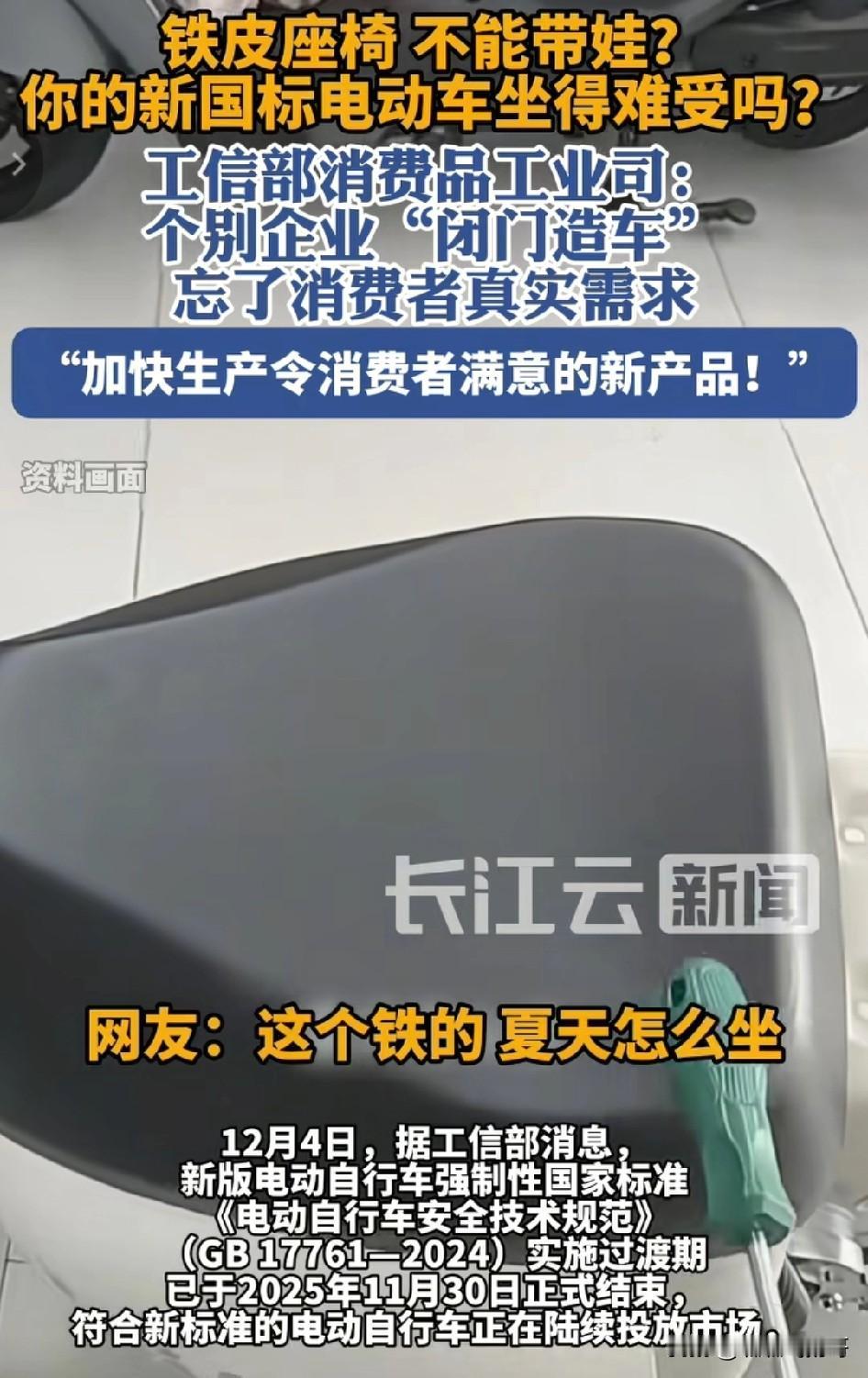 新国标电车一上市就闹笑话! 电动自行车就是装上电让老百姓出行省一点力,就是普通老百姓出行的代步工具而已。 就是这么一辆普普通通的电动自行车从来没有消停过 ,不少人总是对这电动自行车折腾来折腾去。 先是必须给它装上脚墩子, 说没电了可以用脚蹬 , 最后骑车的人发现这脚蹬子就是一个鸡肋,骑行时它会随车轮子一起转动误伤脚面, 买回新车第一件事就是卸脚蹬。 最搞笑的是还不能安装后视镜,说超过了车身的尺寸 。 既然弊病这么多,那就改呗 。 脚蹬子可以不装, 那就装北斗定位系统,目的是防止车被偷 。 这系统可不是白装的 ,它需要成本,于是电车的价格就上来了 ,有的涨500,有的涨600,有的涨1000多 。 过去一辆电瓶车一两千块就可以买回家了,现在需要三四千 。 价格贵一点 ,咬咬牙都可以承受,但是它的限速却没变,仍然是每小时不能超过25km ;座位设计除了短就是窄,除了骑车人,再也不能坐上一个人 ; 更搞笑的是整辆车看似就是一个裸车,没有车篮车筐,连放雨衣头盔的地方都没有;更想不到的是车座可以随便取下来,有的弄成铁皮的, 硬邦邦不说,冬天冷,热天烫 , 完全没有舒适感 ,说是弄成塑料的容易燃烧。 过去人们之所以喜欢电动自行车,图它去菜市场买个菜,送孩子上个学, 送朋友赶个地铁 ,方便,实惠,价格不贵,现在这些好处全没了 。 这些配饰为什么没了?专家说是为了骑车人的安全。超速容易发生交通事故 ,装这装那,如果搭载成年人,会造成车辆缺乏稳定性 。 总之一切都是为了骑车人安全着想 。 超速确实易发生交通事故, 但是因为车的原因吗? 哪一次交通事故不是因为骑车人不遵守交规和不良的骑车行为造成的 。 头疼医脚,根源不在车,在骑车的人 。 一句话 ,现代科技的应用目的就是造福人类, 为用户提供方便, 站在用户的角度才会受欢迎。