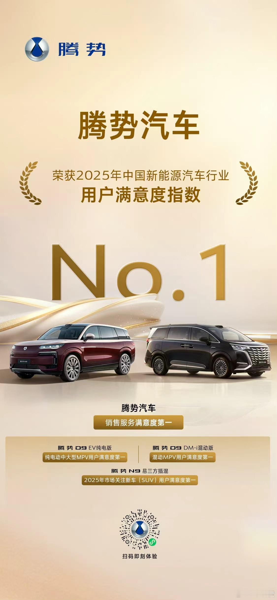 中国质量协会3日在北京发布2025年中国新能源汽车行业用户满意度指数(NEV-CACSI)测评结果。新能源汽车行业中自主品牌用户满意度得分为80分,与合资品牌持平,而在燃油汽车行业,低于合资品牌1分。在实际体验方面,新能源汽车行业中自主品牌百辆新车故障(问题)次数显著低于合资品牌,尤其是智能座舱故障(问题)次数低于合资品牌。在具体细分车型在满意度排行中,腾势收获颇丰。腾势D9 DM-i、腾势D9 EV、腾势N9分别荣获混动MPV、纯电中大型MPV、2025年市场关注新车(SUV)第一。除此之外,腾势汽车销售服务满意度也荣获第一。中国质量协会这个评比还是比较严肃和科学的。该协会已连续11年开展中国新能源汽车行业用户满意度测评。本年度测评聚焦2025年销量较高的162款品牌车型,涉及全国40家汽车生产企业、55个汽车品牌。调查范围涵盖东部、南部、西部、北部、中部五大市场区域的128个重点城市,共收集有效调查样本25303个。在这种调查中,腾势能获得好成绩,值得点赞。现在营销成本都很高,而一个低成本并且高回报的方法,其实就是服务好老客户。老客户满意度高,转介绍高,营销成本就降下去了。赢得新客户的最好方式,就是服务好老客户。腾势N9科技安全旗舰SUV腾势汽车安全之王新能源MPV冠军腾势D9第30万辆交付美好生活腾势而上