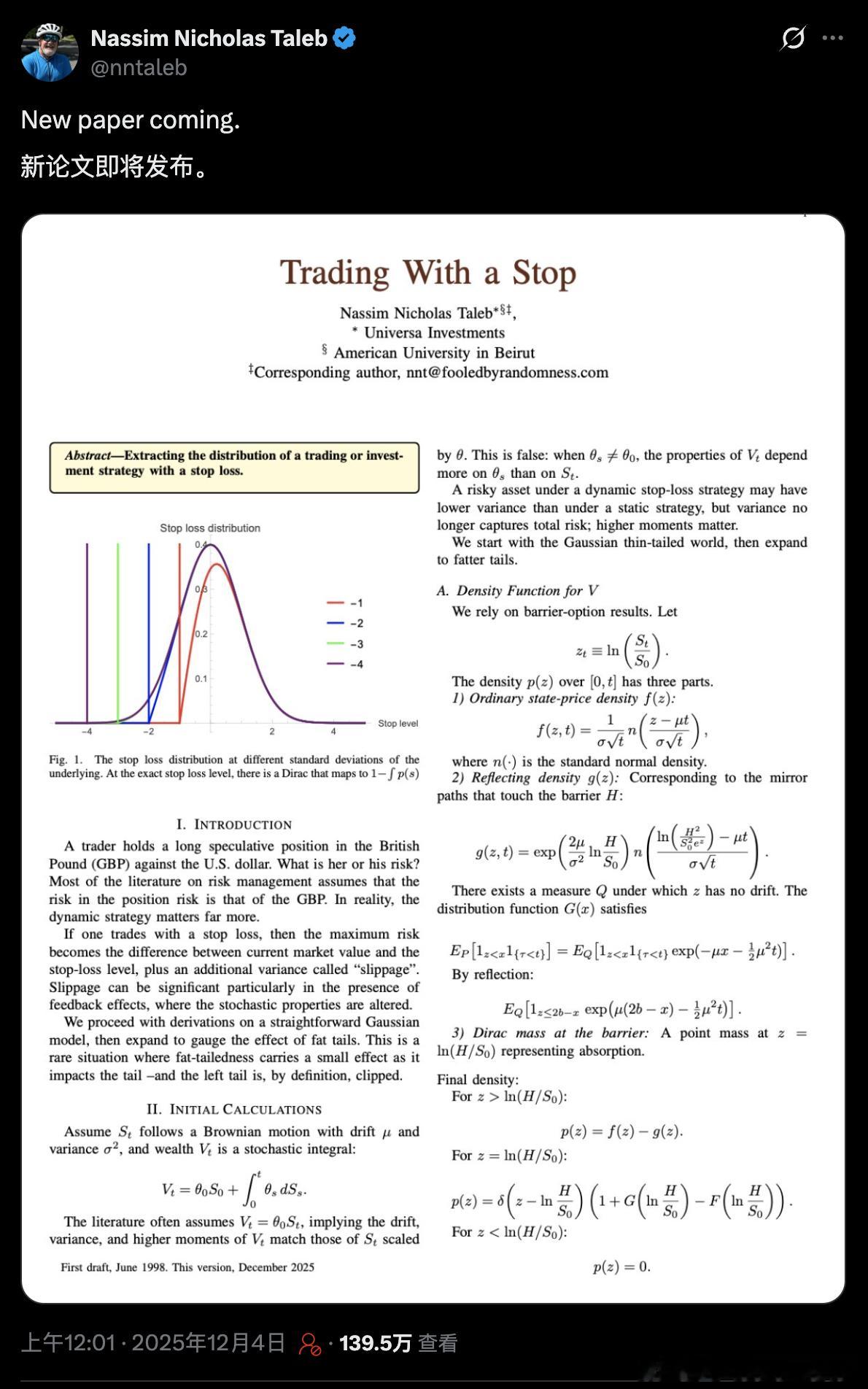 《黑天鹅》的作者 纳西姆·尼古拉斯·塔勒布发布了最新研究AI总结出结论是:止损策略将左侧原本不可控的尾部大跌风险,在统计分布上全部“剪切”并堆积到了止损线这一个点上,从而形成了一个极高概率的“触线离场”事件。所以止损不是降低风险,而是把“大概率慢慢死”换成“小概率靠一次天神下凡翻身”的彩票。