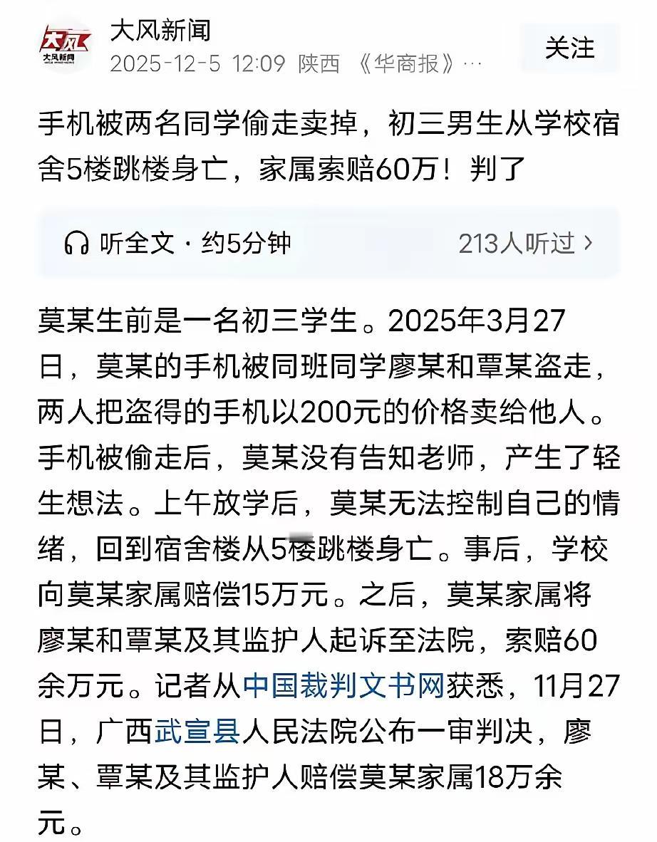 这起事件是一场令人痛心的悲剧,也反映出未成年人在面对冲突、挫折时应当如何正确应对。下面从法律角度和家庭、学校的责任进行分析。 一、法律责任分析 关于廖某、覃某的责任: 根据《民法典》第1188条,未成年人属于限制民事行为能力人,其侵害他人权益应由监护人承担责任。两人偷偷拿走小莫的手机,并将其售出获利,构成侵权行为。他们的监护人在尽到必要的监护职责的情况下仍未防止其违法行为发生,应承担20%的责任。 关于小莫的责任: 小莫作为15岁的未成年人,属于限制民事行为能力人。由于其偷偷携带手机,违反学校规定,造成了心理压力和最终的轻生行为。根据《民法典》第1173条,他的过错在引发自己伤害中占主要责任。法院认定其自我伤害负主要责任,此符合“过失相抵”的法律原则。 关于学校的责任: 学校在其职责范围内应加强对学生的管理和心理疏导。虽然事前加强管理难以完全防止未成年人违反规定,但事后学校赔偿了15万元,说明其已承担部分责任。此次赔偿已解决经济责任,不再作进一步追究。 二、赔偿责任与金额 法院判决廖某、覃某的监护人承担20%的责任,即大约18万余元赔偿金(总赔偿约九万多元),并支付精神损失费1万元。此裁决体现了对未成年人行为责任的法律认定以及对受害者家庭的经济补偿。 三、社会和教育启示 心理健康教育: 青少年正处于心理发展敏感期,应加强心理疏导和情绪管理教育,让他们学会健康处理挫折。 家庭教育: 家长应多关心孩子的心理状态,及时倾听,帮助他们建立正确的价值观和应对困难的方法。 学校责任: 学校应完善管理措施,强化学生的心理健康教育,建立良好的沟通渠道,避免压力积累转变为极端行为。 四、总结 这起事件强调,法律对未成年人的责任认定要兼顾成长事实和过错程度。未成年人应在法律和家庭教育下学会正确应对挫折,社会也应共同营造安全、温馨的成长环境。家长、学校和社会应共同努力,减少此类悲剧的发生,保护青少年的身心健康。 建议: 加强心理健康教育,设立心理咨询通道。 家庭中多倾听孩子的心声,给予积极引导。 法律和社会应继续完善未成年人保护体系,促进青少年的健康成长。十四岁刑事责任 未成年人案