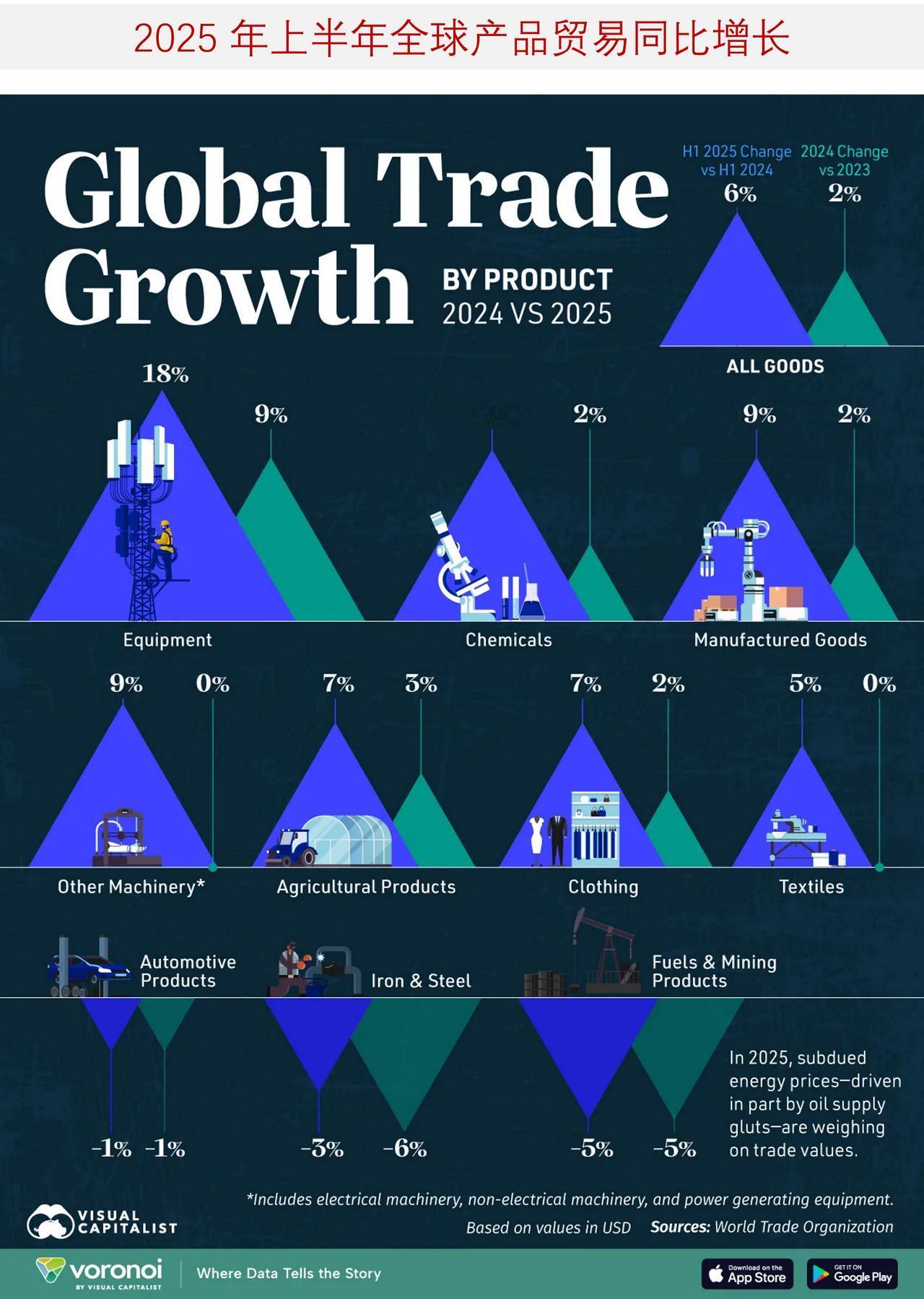 2025 年上半年全球贸易同比增长了 6%,但燃料和矿产品贸易额下降了 5% 在 2025 年上半年,全球货物贸易额同比增长了 6%。 这是前一时期增长速度的三倍,这凸显出企业正在迅速适应贸易壁垒。至于关税在 2026 年是否会开始产生影响,这仍是一个未知数。 下面这张图表展示了 2025 年上半年各类产品的贸易增长情况,数据来源于世界贸易组织。 2025 年上半年,办公及通讯设备(包括电子设备和与人工智能相关的基础设施)的销售额年增长率达到了 18%。 值得注意的是,这一增速是去年的两倍。因为人工智能设备的建设(尤其是在北美地区)推动了对半导体、服务器及相关设备的需求。事实上,人工智能相关产品的贸易支撑了全球贸易增长的约一半。 如我们所见,化学品贸易增长了 10%,而农业产品和服装产品的贸易额则分别增长了 7%。主要的化学品出口市场,如中国和印度尼西亚,增长势头强劲。与此同时,欧洲的化学品制造商面临着需求疲软的局面。 与此同时,燃料和矿产品贸易额下降了 5%。这与 2024 年出现的情况类似,当时石油供应过剩以及能源价格低迷对贸易造成了影响。截至 12 月 2 日,今年西德克萨斯中质原油的价格已下跌约 16%。