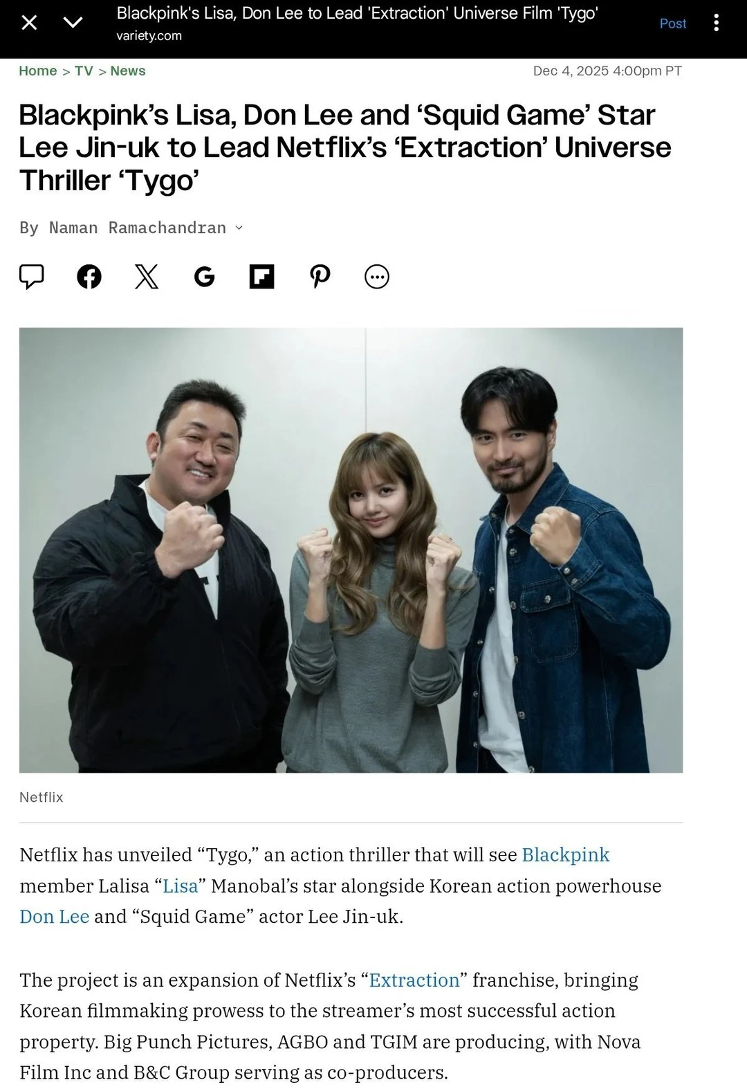 Lisa官宣参演网飞动作片惊天营救,演员莎要上线啦,剧本围读照好温柔气质,期待打戏! 图片cr:网络