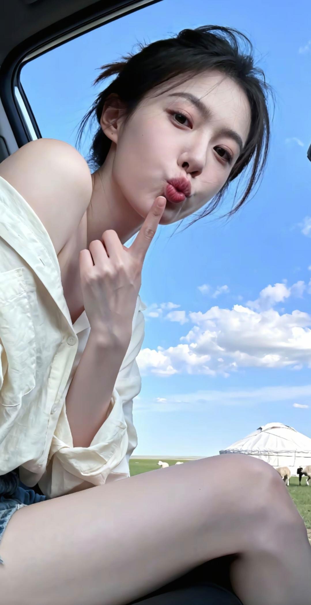 风把衬衫角掀起来,她指尖抵在唇上,像藏住了半口草原的风。车窗外是漫到天底的绿,白蒙古包浸在云影里,羊群啃着日光——而她蜷在车厢这方小天地,领口松松垮垮漏出肩线,发梢还沾着旷野的碎风。 这甜是漫不经心的:像把草原的蓝、云朵的软,都揉进一个翘唇的小动作里。连风钻进来时,都裹着她发梢的温度,把旷野的辽阔,缩成了车窗框里的、带点娇憨的甜。