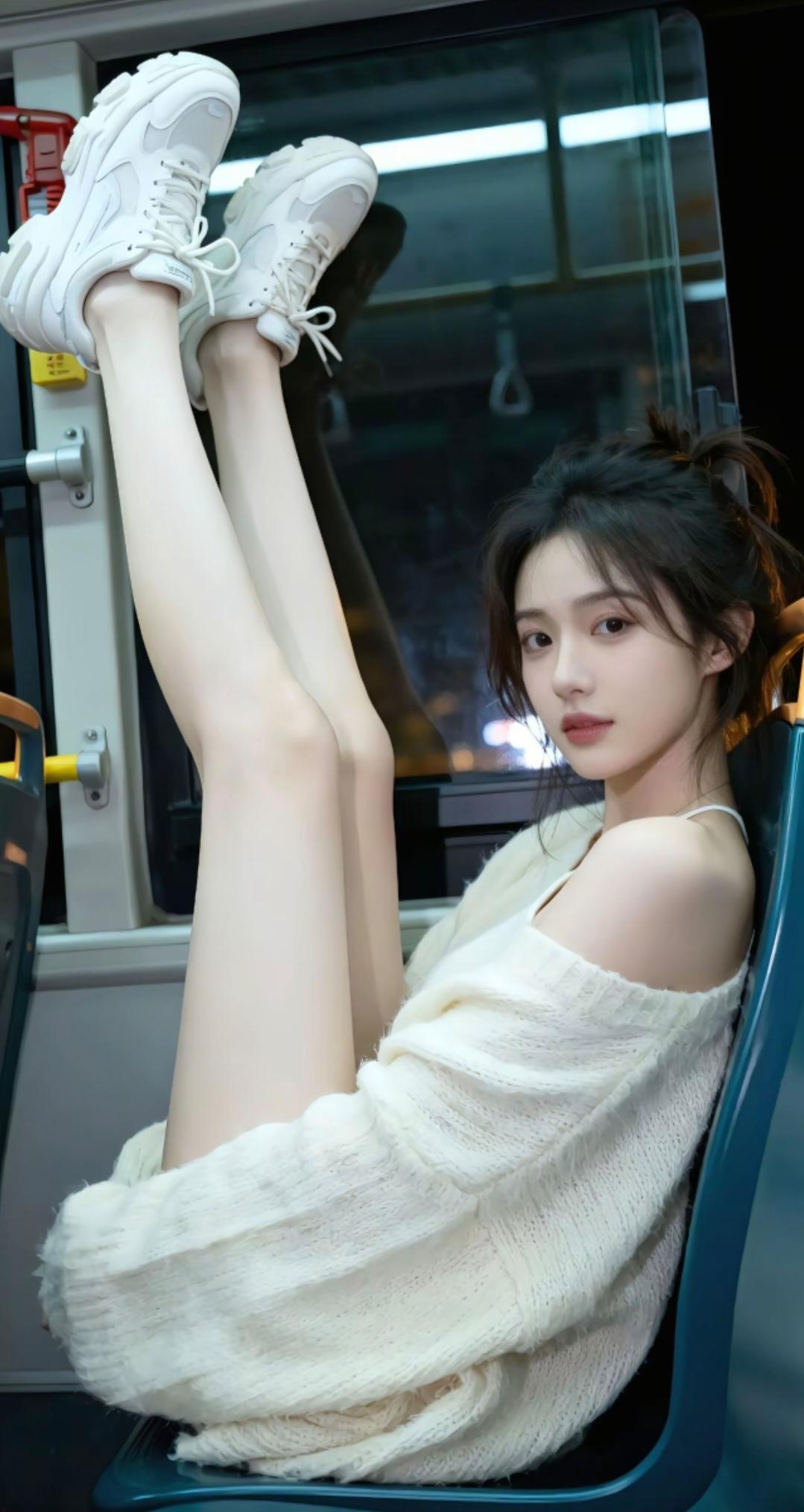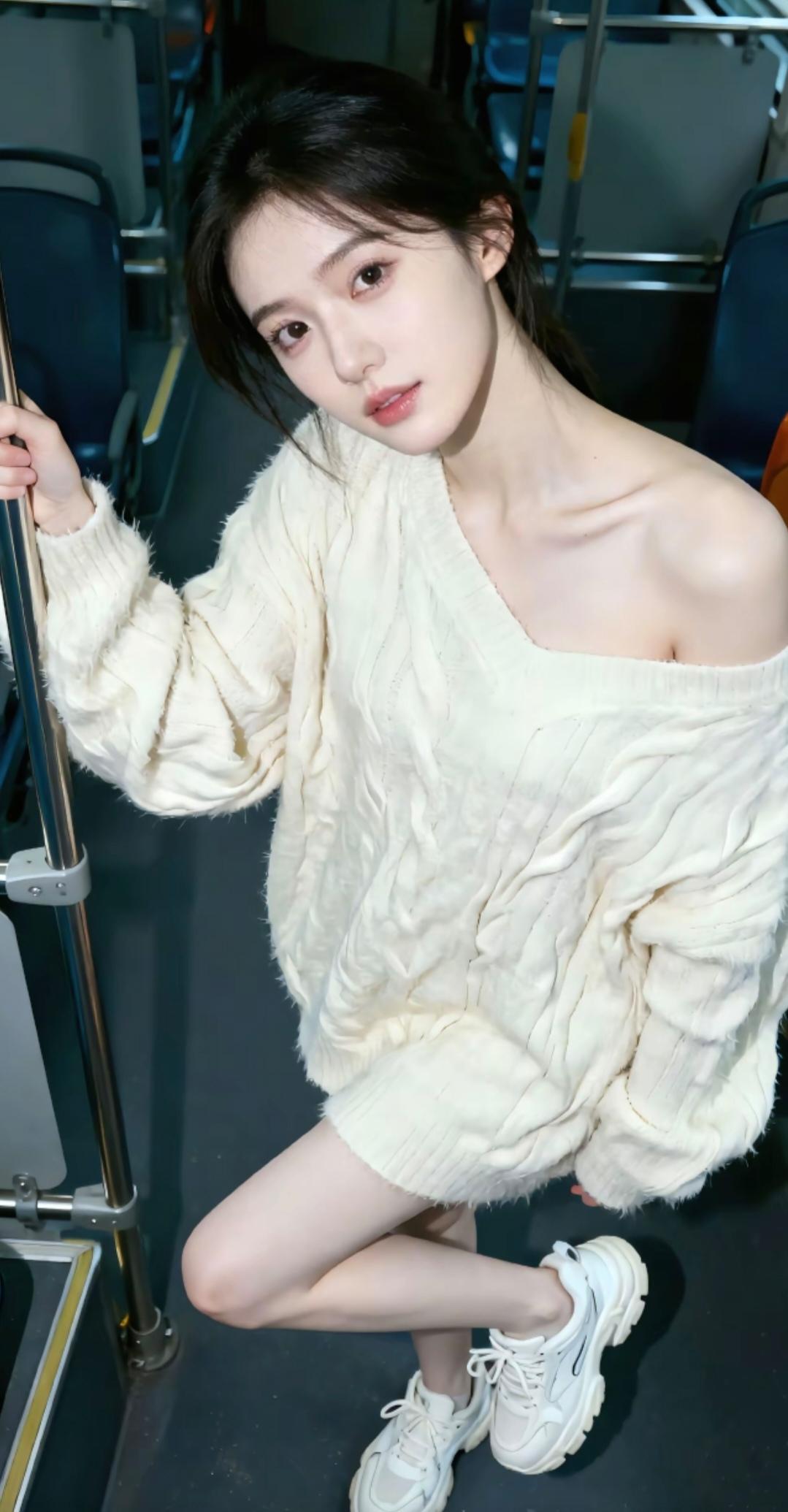 地铁的冷光漫过针织的绒毛,她蜷在行李箱上,像把一团软云穿在了身上。露肩的弧度漏进车厢的风,衬得颈线比扶手更清瘦,毛衣下摆垂落时,恰好掩住漫不经心的慵懒。 金属座椅的冷、扶手的硬,都成了这团暖白的背景板。她没看疾驰的窗景,只把脚踝搭在箱沿,让运动鞋的白和毛衣融成一片——像在通勤的惯性里,偷藏了半刻蓬松的松弛。