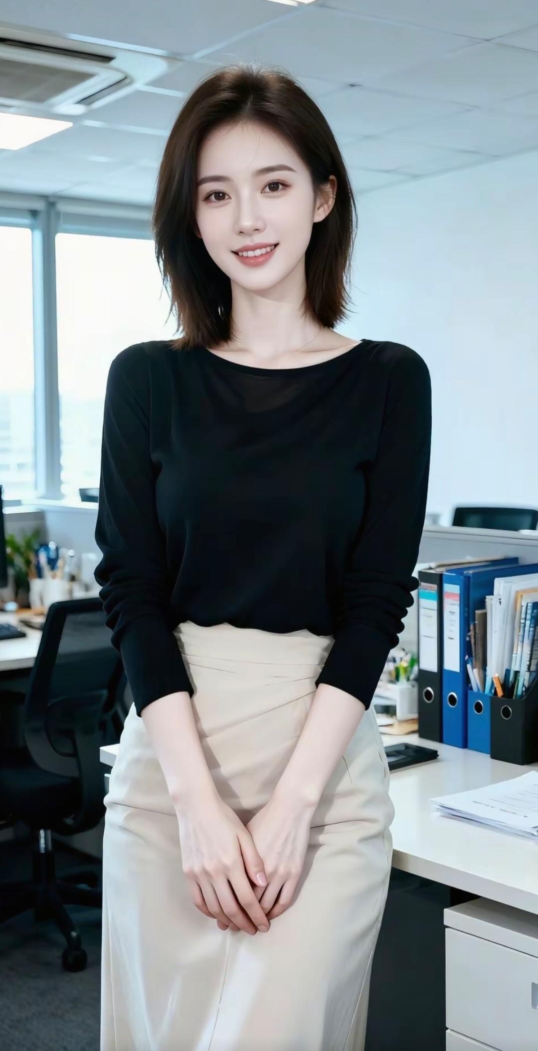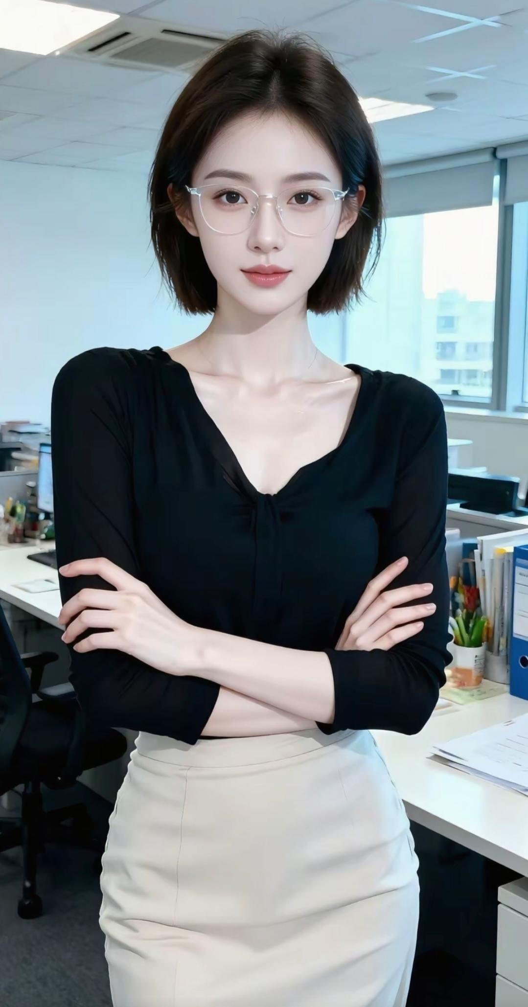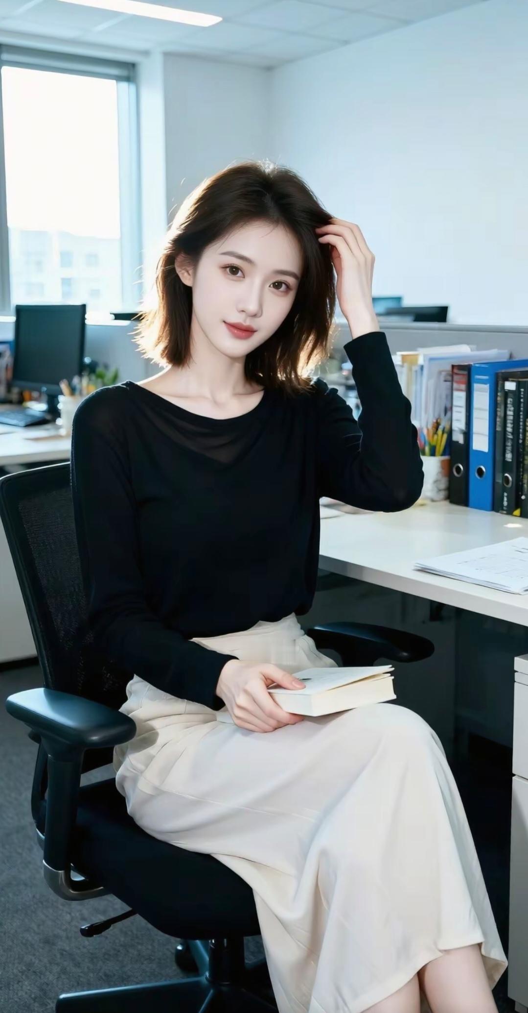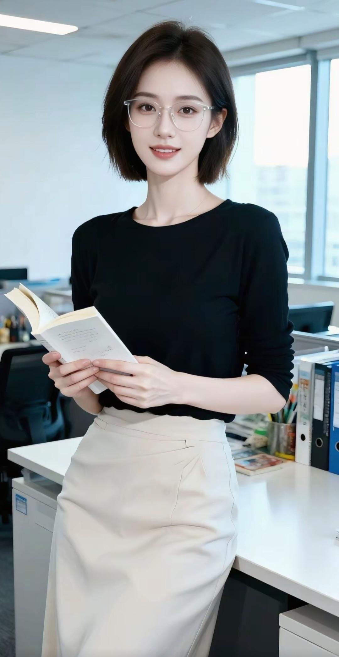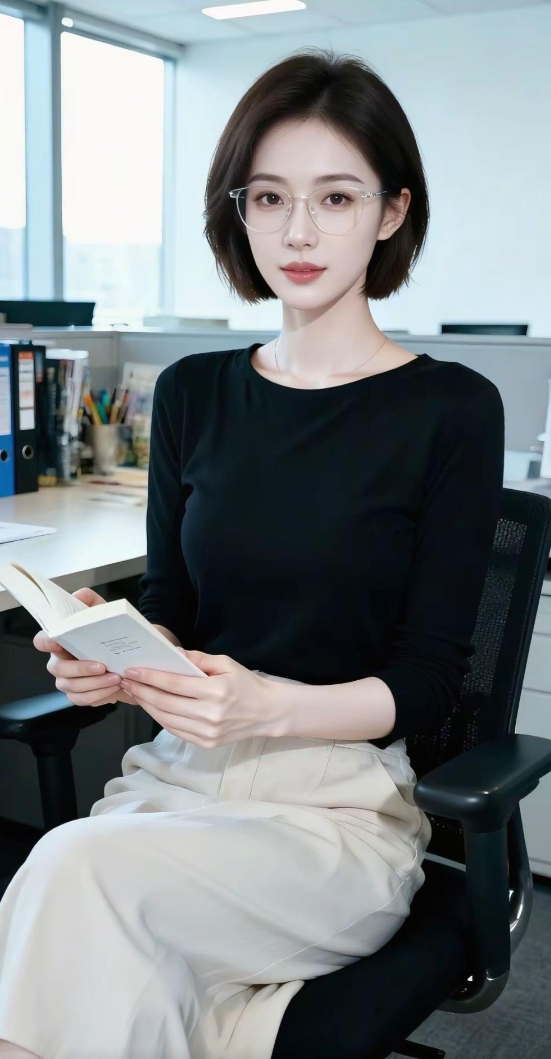 写字楼的冷光落在她的黑衫上,衬得米裙像午后漏进格子间的光斑。半框眼镜架着柔和的眼尾,书页翻开时,连文件夹的棱角都软了几分。 工位上的笔桶、堆叠的档案,是职场的惯性布景,她却把书捧成松弛的注脚——指尖轻压纸页的弧度,比键盘敲击声更轻,比窗外楼群的线条更软。