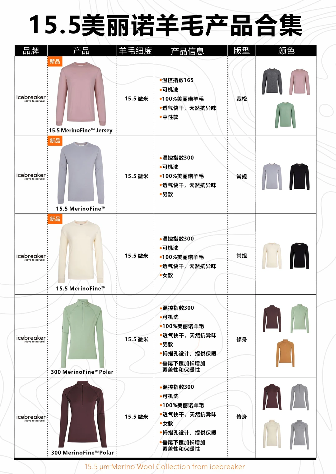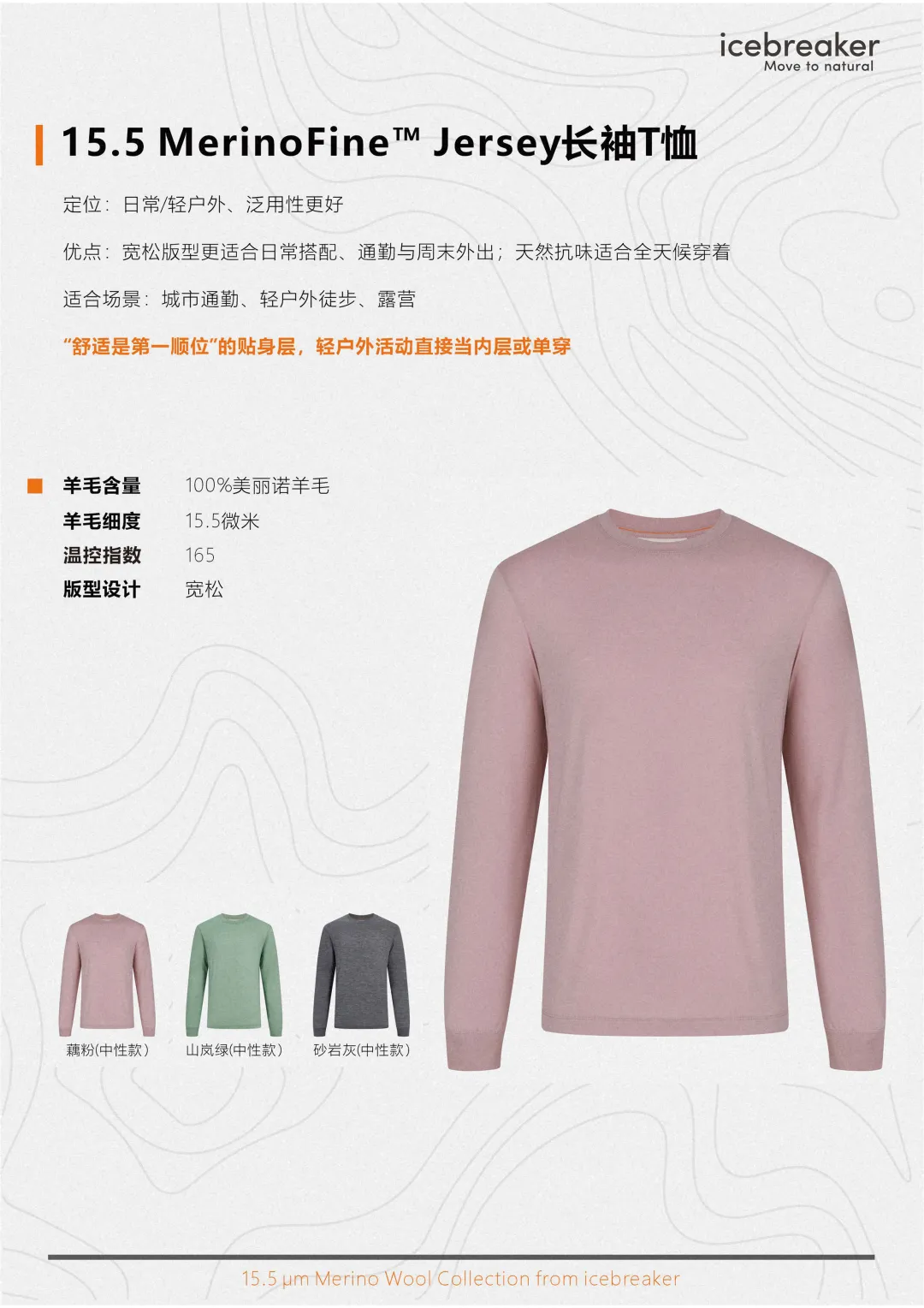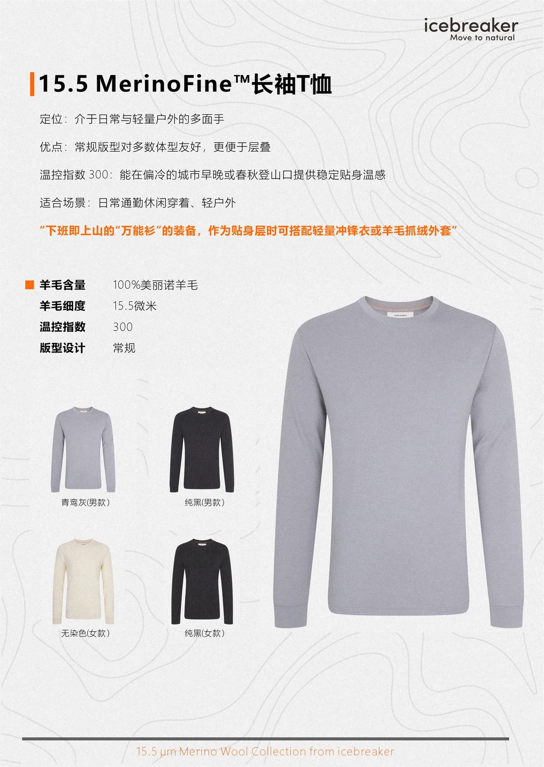 下面我把 icebreaker 这几款以100% 15.5微米Merino为核心的新品拆开讲,看看羊绒般细腻质感的羊毛如何呈现到产品