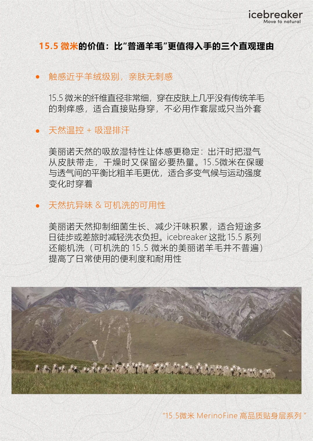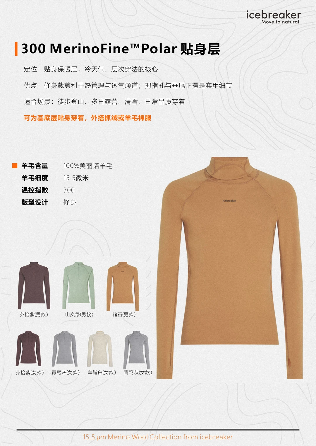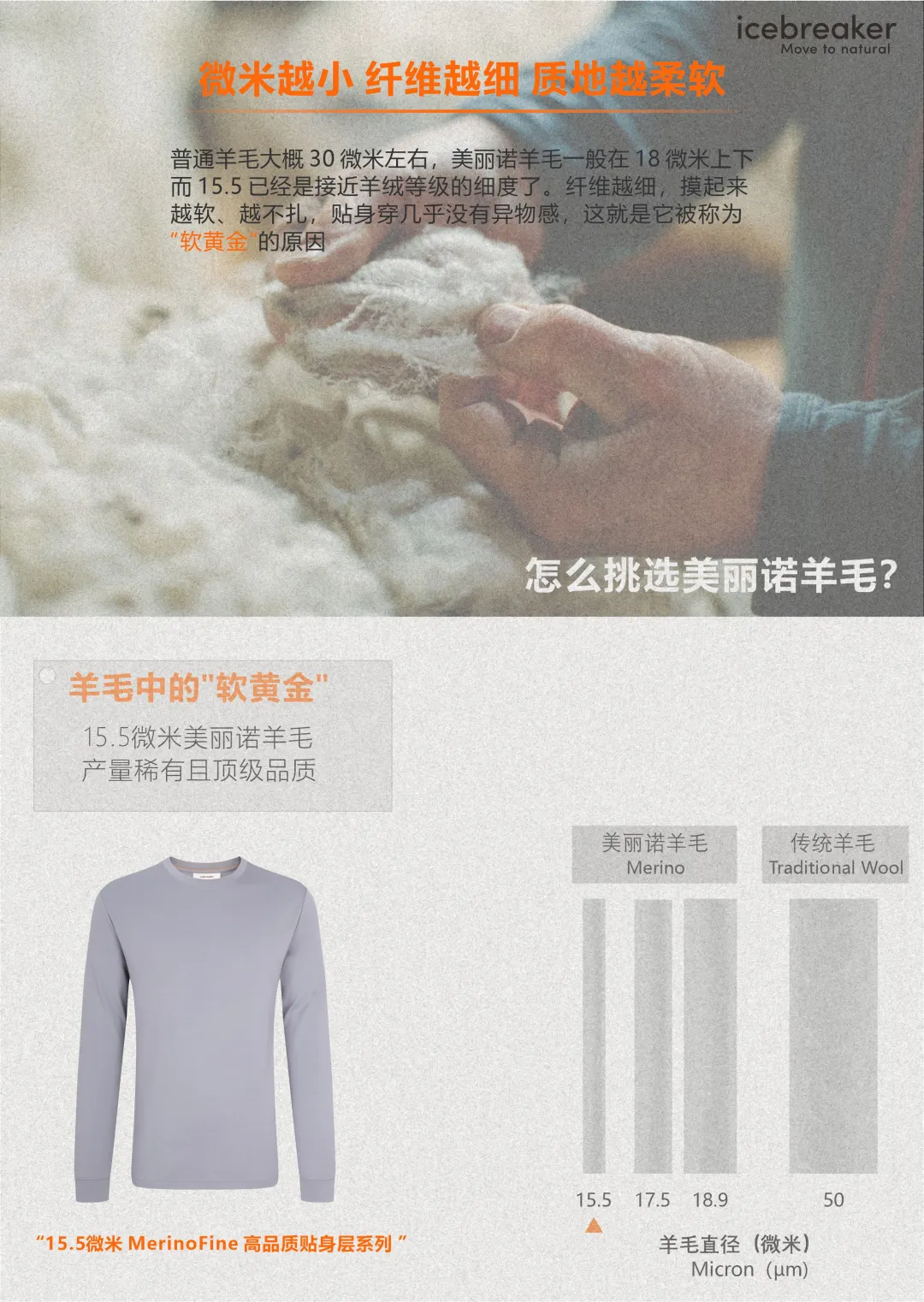 下面我把 icebreaker 这几款以100% 15.5微米Merino为核心的新品拆开讲,看看羊绒般细腻质感的羊毛如何呈现到产品