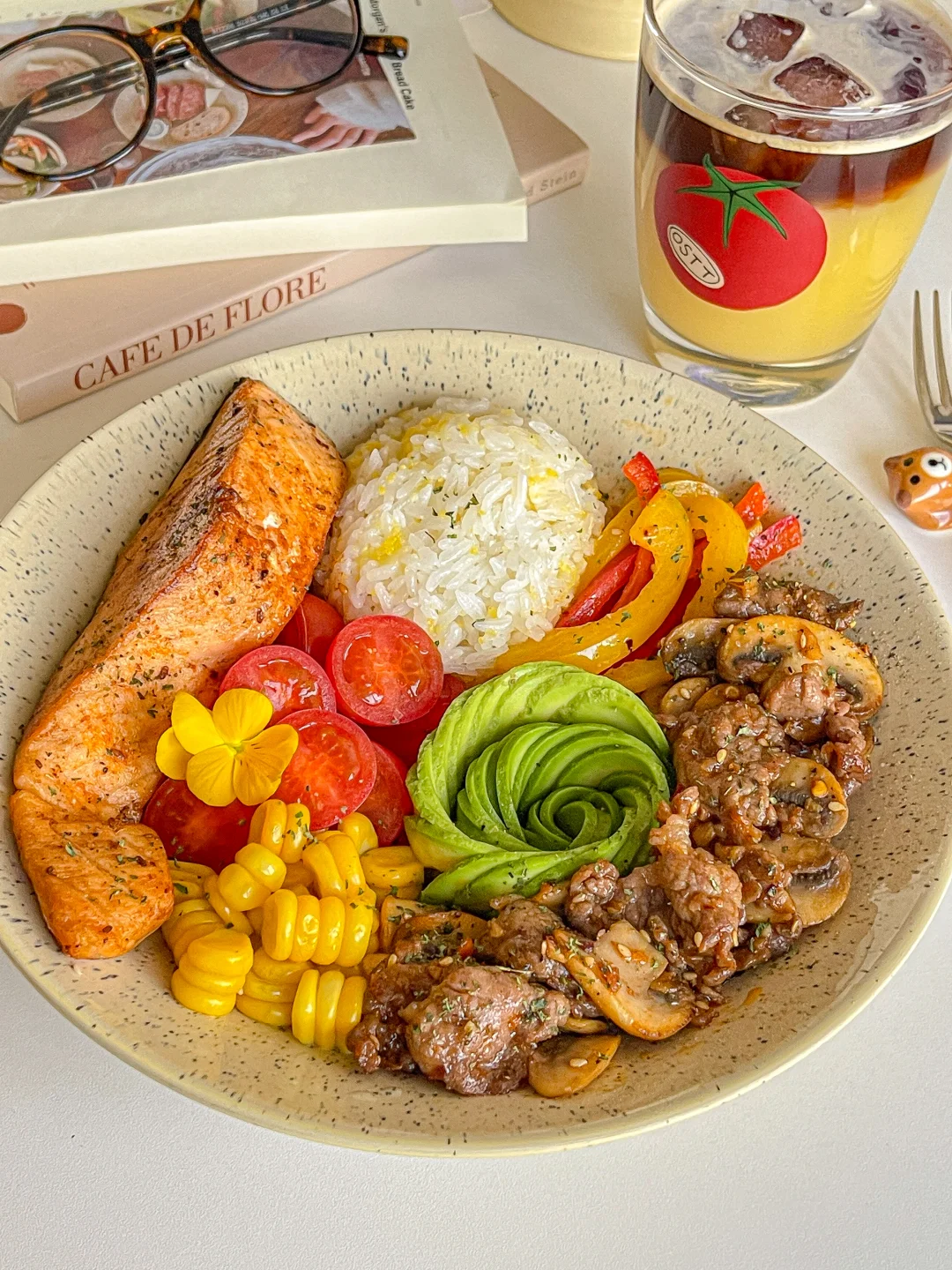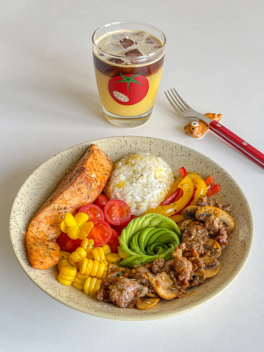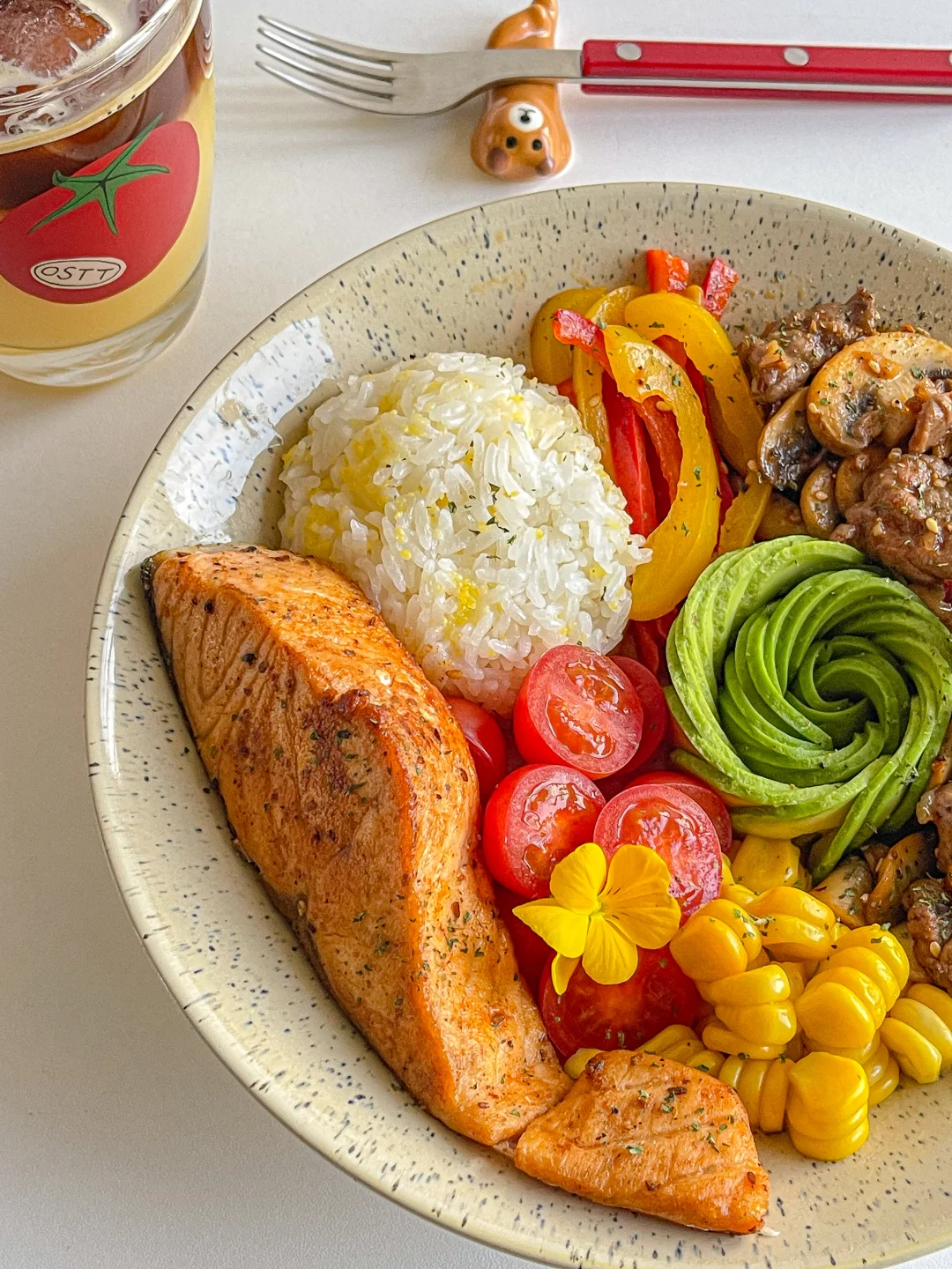 下半年真是节日多 生日更多 聚会多吃的也多[喝奶茶R] 今天开始自律餐! 食材:🥑 煎三文鱼➕牛油果➕牛肉炒口蘑➕玉米➕圣女果➕彩椒➕玉米碎米饭 一拳米饭搭配丰富的蛋白质与膳食纤维 自律餐也可以hin好吃[亲一个R]