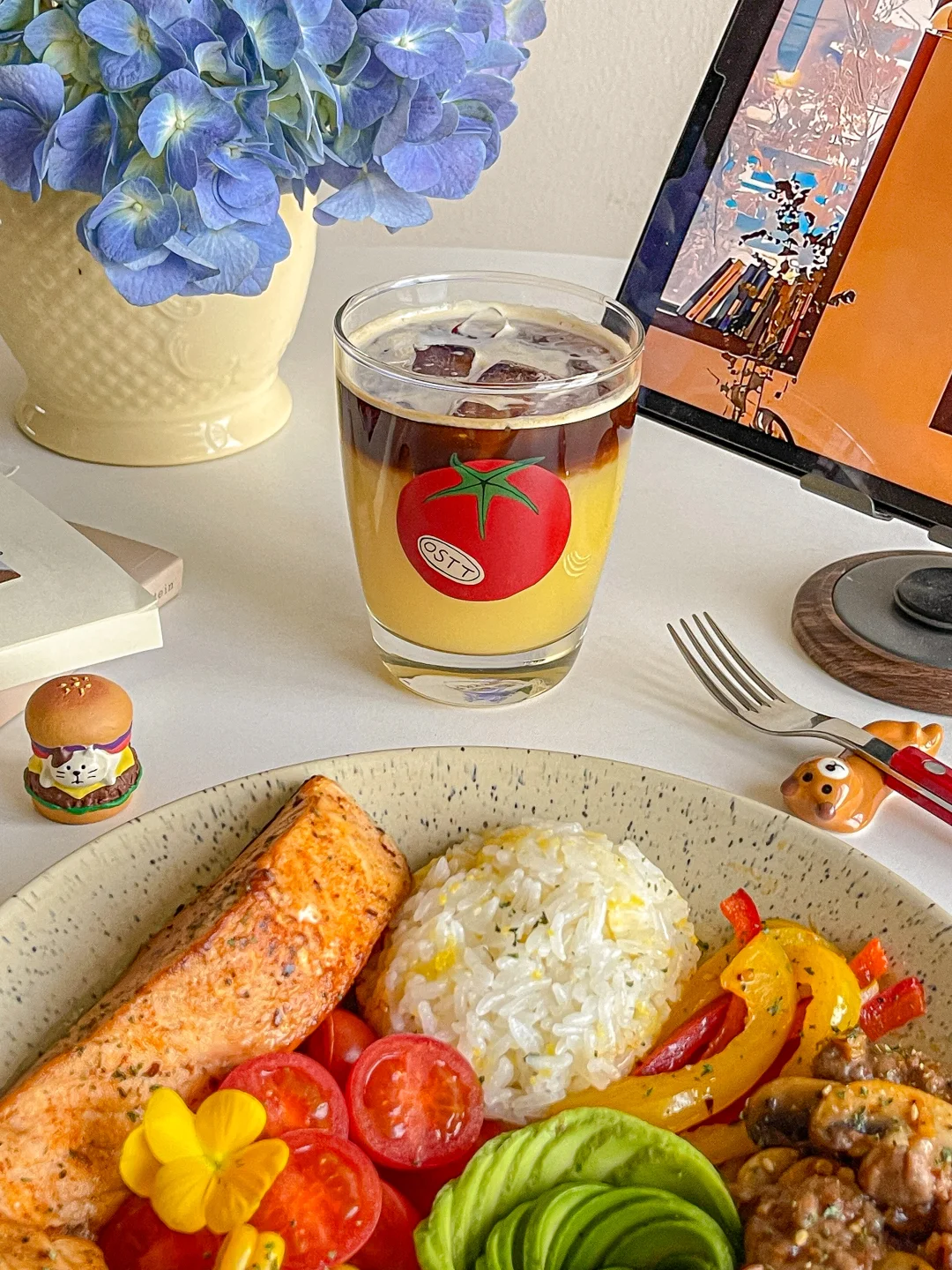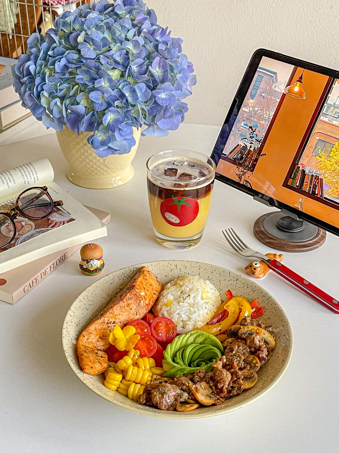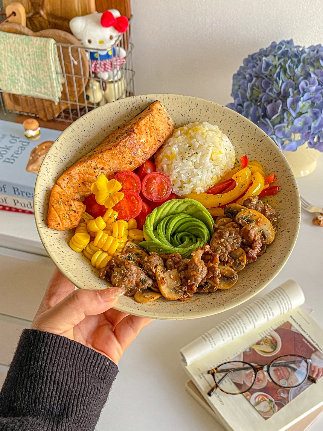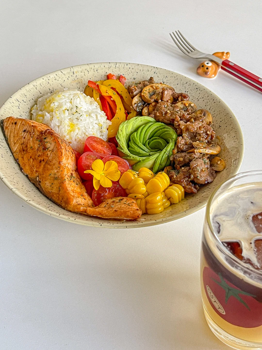 下半年真是节日多 生日更多 聚会多吃的也多[喝奶茶R] 今天开始自律餐! 食材:🥑 煎三文鱼➕牛油果➕牛肉炒口蘑➕玉米➕圣女果➕彩椒➕玉米碎米饭 一拳米饭搭配丰富的蛋白质与膳食纤维 自律餐也可以hin好吃[亲一个R]