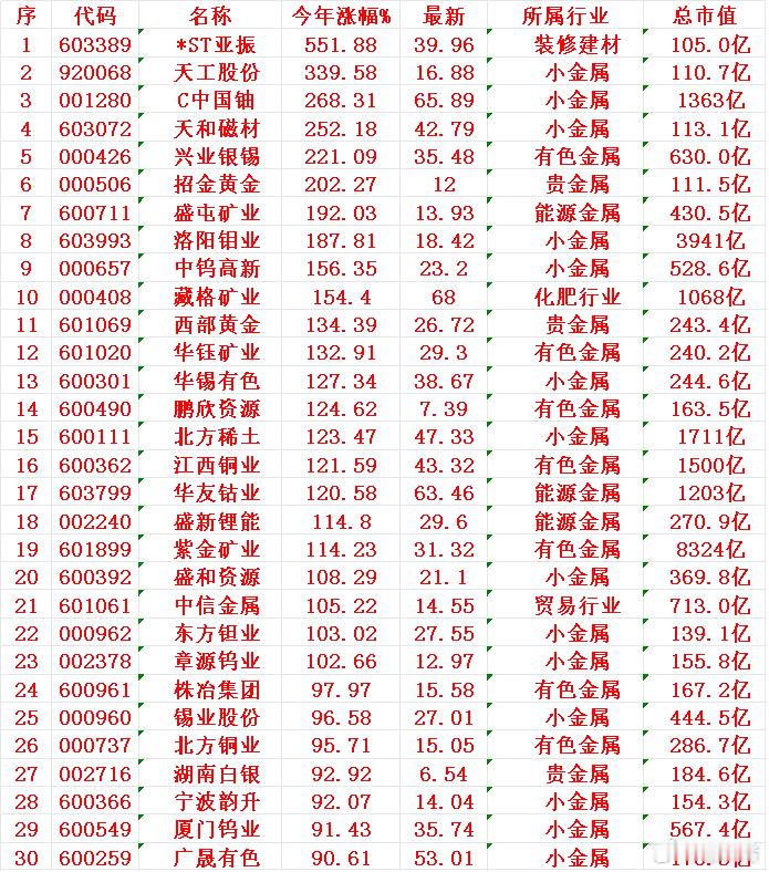 小金属概念,2025年以来涨幅最多的30名单ST亚振:今年涨幅 +551.88%,最新价 39.96元天工股份:今年涨幅 +339.58%,最新价 16.88元C中国铀:今年涨幅 +268.31%,最新价 65.89元天和磁材:今年涨幅 +252.18%,最新价 42.79元兴业银锡:今年涨幅 +221.09%,最新价 35.48元招金黄金:今年涨幅 +202.27%,最新价 12.00元盛屯矿业:今年涨幅 +192.03%,最新价 13.93元
