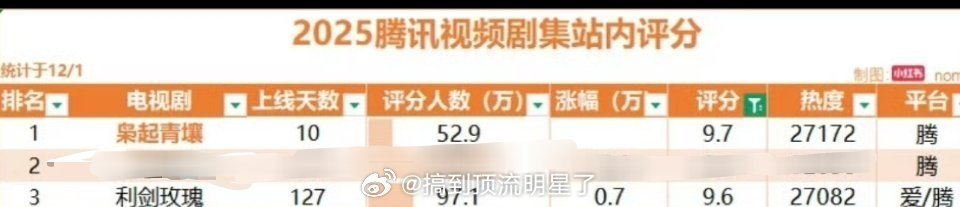 恭喜迪丽热巴《枭起青壤》评分9.7成为2025腾讯视频剧集站内评分TOP1!且前三占二,《利剑玫瑰》9.6为TOP3,评分人数都达到50w以上,迪丽热巴90唯一视后的扛剧含金量枭起青壤利剑玫瑰