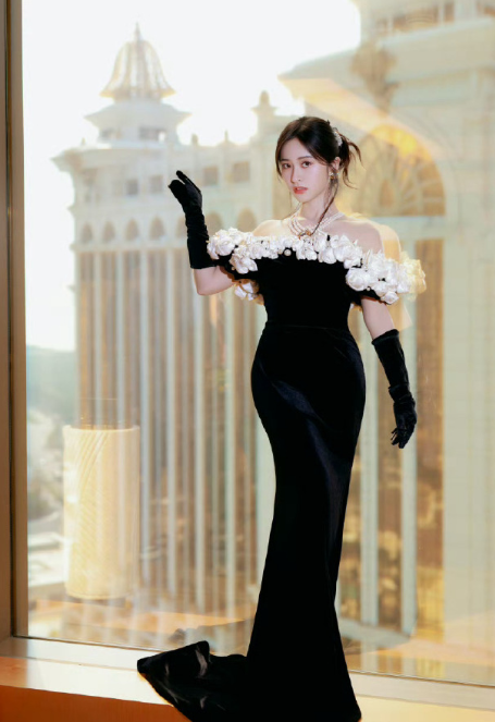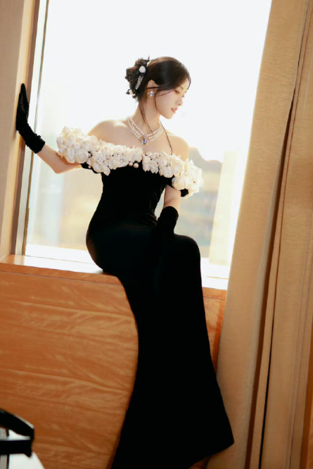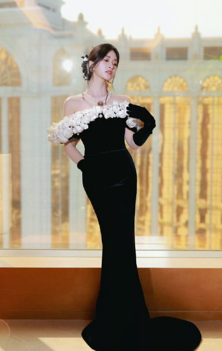 沈月鎏光落肩,黑丝绒裁成风骨,白玫瑰缀满温柔。在光影交织的时刻,自成一场不动声