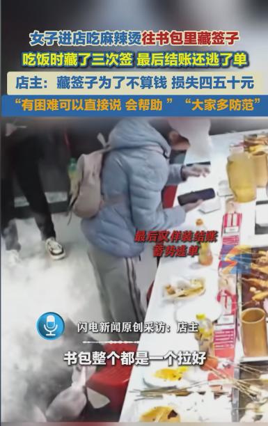 吃不起饭就别出来丢人!内蒙古包头,一女子吃麻辣烫偷偷把签子塞进书包,还在结账时趁店员转身,没付钱直接跑了。事后,店主看了监控,哭笑不得,只能无奈提醒同行注意。 有些人啊,精力全用在了“抠门省钱”上,能把一顿麻辣烫玩成“谍战片”。本事不是没有,就是用错了地方。小聪明得了便宜,丢了格局,结果图啥呢? 其实这事发生得非常突然。那天傍晚,店里刚刚忙起来,外面刮着风,屋里热气腾腾。老板一边招呼顾客,一边盯着锅里翻腾的签子。 突然,前台那边响起一阵小骚动。有顾客结账时,扫码枪还没扫完,人就跑没影了。 老板本想追出去,结果人早跑远了。回头一看,剩下的签子怎么也不对数,监控一查,才发现:原来这位“女特工”早就把吃过的签子一根根擦干净,塞进自己带的包里。 买卖难做,防人更难。你说大家都不容易,结果还有人专门琢磨怎么薅小摊的羊毛。这点“小机灵”,搁在生活里是祸根,搁在职场怕不是要被老板直接开了。 说句实在的,现在做小生意的都不容易。房租水电、物价飞涨,一个月辛辛苦苦,能剩下的都是血汗钱。 如果你觉得占点小便宜没啥,跑单又不会被抓,那最后受伤的,其实是社会的信任感。想想看,要是人人都这么干,服务业还怎么活? 有些人省钱省进了骨头里,亏的是气度,丢的是人品。这年头,能靠诚信立身的,才是真本事。 想象一下,锅里翻滚着红油,桌上堆着签子,客人们吃得热汗直冒。就这时候,有人低着头、悄悄把签子一根根擦净塞进包。 四下没人注意,她还特意装作若无其事,时不时瞄一眼前台。等到结账时,手里只剩几根签子,装得可真像吃得不多。 结果最后连付款都省了,直接溜之大吉,动作一气呵成,专业程度让人怀疑是不是练过。 小偷小摸虽不至于进监狱,但总会被人记住。别以为天衣无缝,社会有记忆,信用有账本。 你今天薅了一家麻辣烫,明天就有人薅你。 翻翻社交平台,网友们的吐槽五花八门:“我在奶茶店打工时,常有人偷奶茶杯回家装水喝,还装得理直气壮。” “有顾客吃自助火锅,最后各种小料、餐具全往包里塞,最后假装没看见就走了。” “我们店有顾客吃完饭,非说少给他两只鸡翅,监控一查,鸡翅全进自己兜里了。” 有网友调侃:“总想少点钱,最后少的是自己的脸。” 说穿了,就是钻空子的瘾大于羞耻心。能不能把这点心思花在正事儿上? 其实每个普通人都懂,生活不易,谁都想省点钱。但省钱和抠门、和不诚信,不是一回事。 一个小店主,用自己的积蓄和汗水撑起一间店,熬夜备货、早起收拾,指望的就是多卖几串麻辣烫。 你觉得偷几根签子没啥、逃个单不碍事,可你的“小聪明”其实把别人的苦心踏在脚下。 这城市里,多少温暖都藏在小摊小店里。老板记得你的口味、给你多加点菜、下雨天还多送你一把伞。 可一旦信任被消耗光,大家都变得冷漠、互防,最后受苦的还不是自己?诚信,是社会最值钱的资产。 一根签子、几块钱的饭钱,算不了什么,但如果人人都“聪明一把”,商家就会变得冷漠、服务会缩水,甚至最后只能涨价来补亏。 真正有本事的人,敢于承担、敢于付出,不会偷奸耍滑。时代再难,也别用小动作去破坏大环境。 愿我们都能多一点体谅,少一点算计,让社会多点温度。 你身边有没有遇到过类似的“逃单”小聪明?你觉得生活中什么才是最不能丢的底线? 【麻烦您点击“关注”,多多点赞、评论、收藏,成为我的铁粉,致力于每天把知识和快乐带给您[玫瑰]】