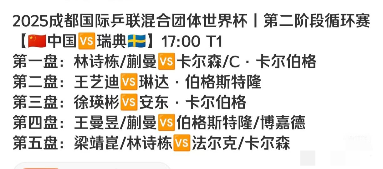 成都混团第二阶段 中国VS瑞典 林诗栋/蒯曼3:0卡尔森/卡尔伯格 11:9,11:7,11:9 国乒队已经锁定第二阶段 小组第一名晋级半决赛啦, 孙颖莎,王楚钦终于可以 休息一下啦, 动漫组合不负众望, 配合默契, 移动速度丝滑流畅, 除了第三局在关键分遇到 困难,顺利化解, 拿下宝贵的三分, 为国乒队奠定了坚实的基石, 第二盘大迪首次出场 对战琳达, 加油!