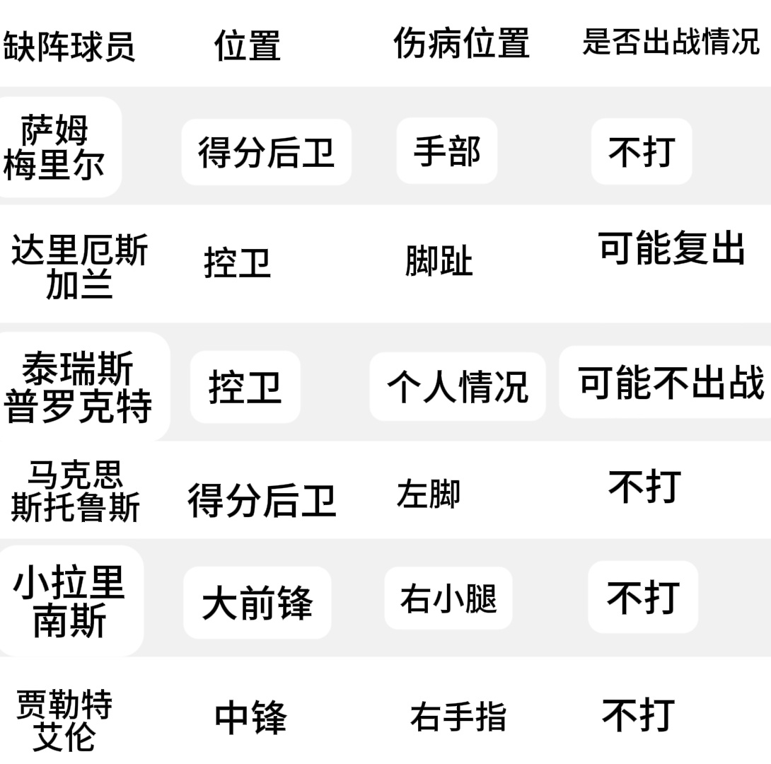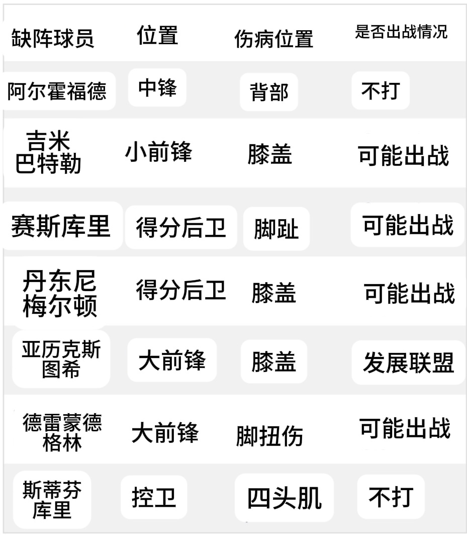 明日上午八点半,客场VS克利夫兰骑士,双方球员伤病名单(图2、3)如果梅尔顿最后出战,期待他明日和球员配合,以下是他昨日赛后采访内容,关于他状态的“哦,当然。我的意思是,我想你明白,这已经是我的NBA第八年了。因此保持高度的自信至关重要。而且我认为向其他队员灌输这种信心也是非常重要的,接下来我要做的就是确保每个人都保持状态良好,因为当他们状态好的时候,我也就状态好。当我状态好的时候,你也知道,我希望整个团队也能状态良好。所以,就像你说的那样,就是要确保我的自信心高涨,这样我才能确保这种信心能够传递到整个团队。”勇士vs骑士 |金州勇士