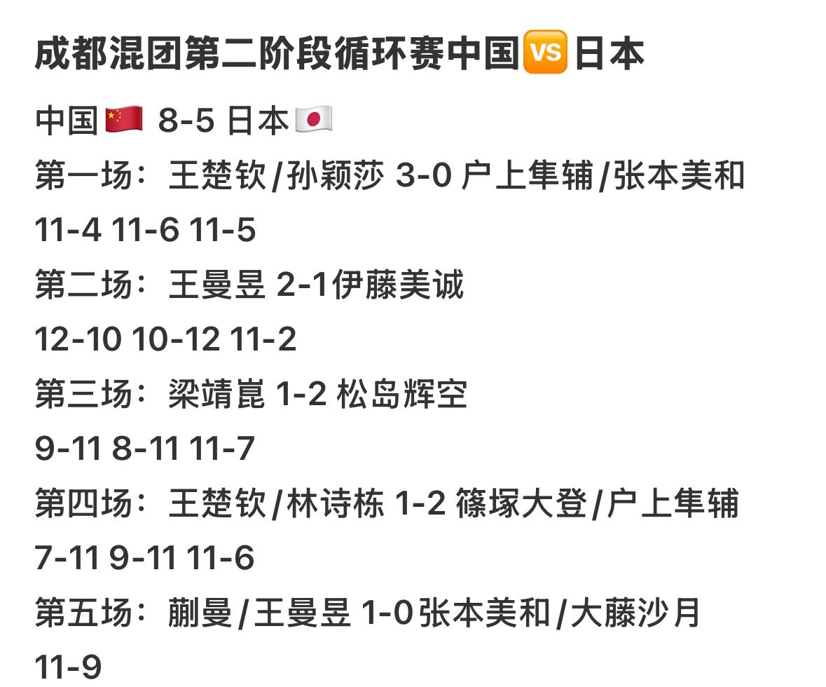 张本美和谈混双对战孙颖莎/王楚钦用了三次“厉害”赞不绝口! 12月6日, 成都混团世界杯第二轮 中国8:5日本, 张本美和在赛后采访谈混双对战 孙颖莎/王楚钦: “我们的混双发挥不错👍, 那等于说对手挺强, 所以,不管打哪里都被 打回来! 还是非常灵活和厉害👍, 两年前在混团的时候, 也和他们交手过, 也是我与户上配, 所以这次也是抱着拼对方的心态, 但是还是对方太厉害👍, 还是孙颖莎/王楚钦实力就比我们强, 我们还是右手 右手, 所以有的时候转不过来, 衔接方面做的不好, 所以我还是觉得 孙颖莎选手 王楚钦选手更厉害👍, 我们在世乒赛上也交手过, 他们的无谓失误很少, 我们在这方面做的还不够吧!” 张本美和用三次厉害赞扬莎头组合, 看来是心服口服了, 明天混团的最后一天, 国乒还会打日乒, 看来日乒要变阵了, 加油,国乒!