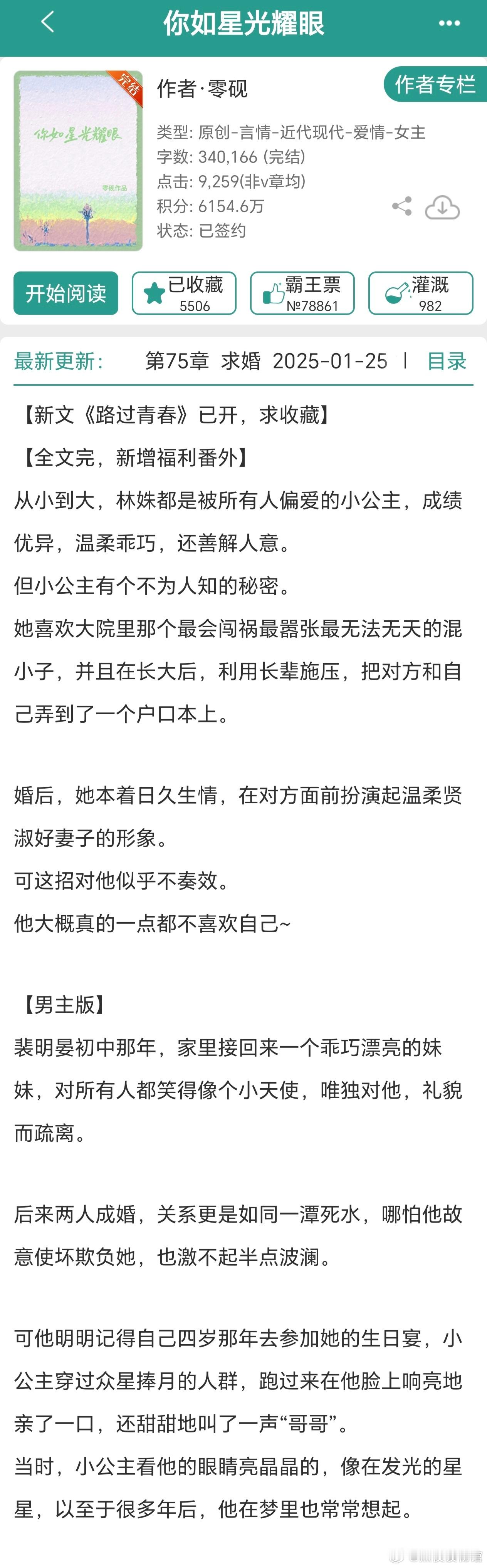 推文 《你如星光耀眼》作者:零砚大明星与大学老师,青梅竹马,双向暗恋男主从小就叛逆,与哥哥反差,出国留学后回来,直接进入娱乐圈。男主背景强,但是靠自己实力在娱乐圈中闯,成为大热明星女主是乖乖女,与人相处温柔中带着疏离。女主父母双亡,但是男主和男主哥哥,尤其是男主爷爷最疼爱她。她不是没有依靠的孤儿,其实她父母的背景也很强女主很早就暗恋男主,但是怕男主不喜欢自己,表明自己心意了后连兄妹也做不成。男主也一直暗恋女主,但是感觉女主对他哥哥的态度比自己好,以为女主喜欢他哥哥,对女主就臭脸,又忍不住关心她两人后来因为一些事情结婚了,隐婚,只有男主家人知道,男主助理和经纪人也知道。男主以为近水楼台先得月,结果自己工作太忙了,聚少离多,而且女主对他感觉很疏离。女主不敢接近男主,就怕自己的感情被男主发现双方都误会对方不喜欢自己,都没嘴,以为在勉强对方,后来离婚了。身边的人看不下去了,男主哥哥助攻,女主知道男主隐藏心意后直接表白,男主后悔同意离婚了两人离婚后开始谈恋爱,后面挺甜的,男主前面忍多辛苦后面就多放纵,女主身体受不了了前面两人没长嘴的时候,看着真的挺难受的,怎么有人能忍那么久啊啊啊啊啊!