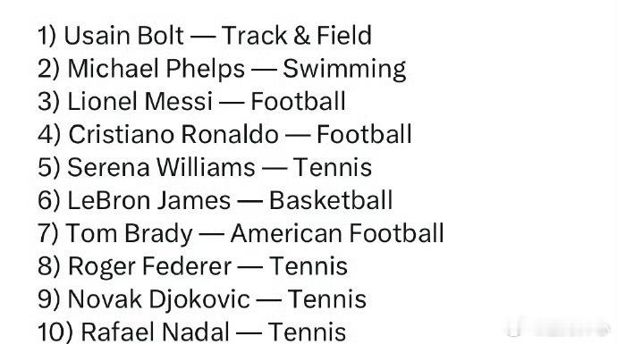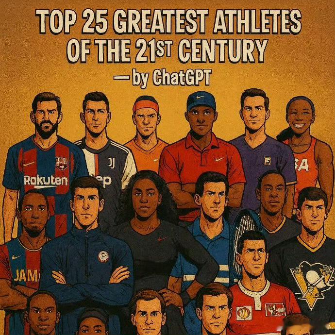 ChatGPT评选的21世纪最伟大运动员排名中,牙买加短跑运动员尤塞恩·博尔特位列第一,美国游泳运动员迈克尔·菲尔普斯第二,阿根廷足球运动员利昂内尔·梅西第三,葡萄牙足球运动员克里斯蒂亚诺·罗纳尔多第四!详细前十名运动员尤塞恩·博尔特(田径)。迈克尔·菲尔普斯(游泳)。利昂内尔·梅西(足球)。克里斯蒂亚诺·罗纳尔多(足球)。塞蕾娜·威廉姆斯(网球)。勒布朗·詹姆斯(篮球)。汤姆·布雷迪(美式橄榄球)。罗杰·费德勒(网球)。诺瓦克·德约科维奇(网球)。拉斐尔·纳达尔(网球)。ChatGPTChatGPT评21世纪最伟大运动员