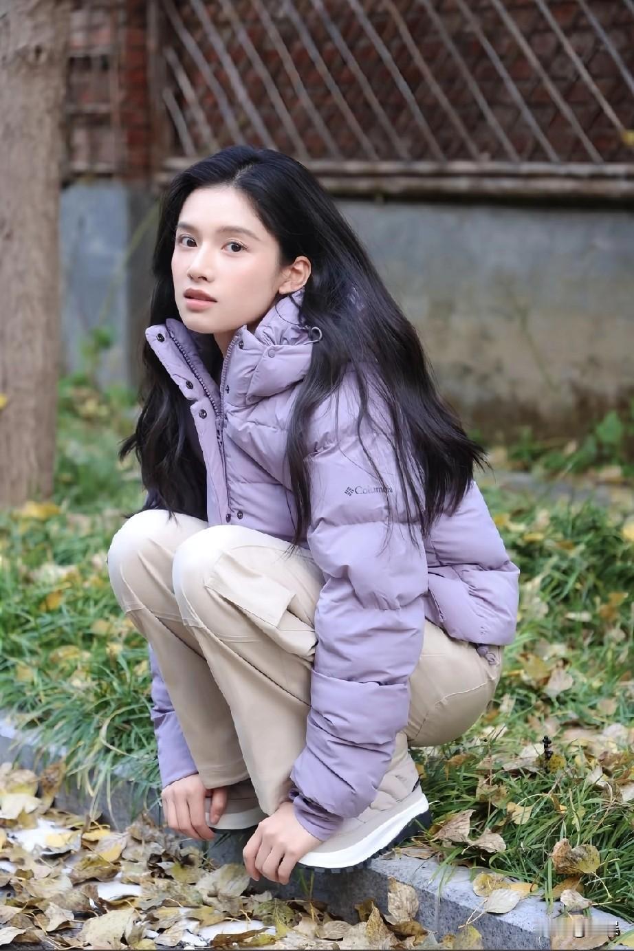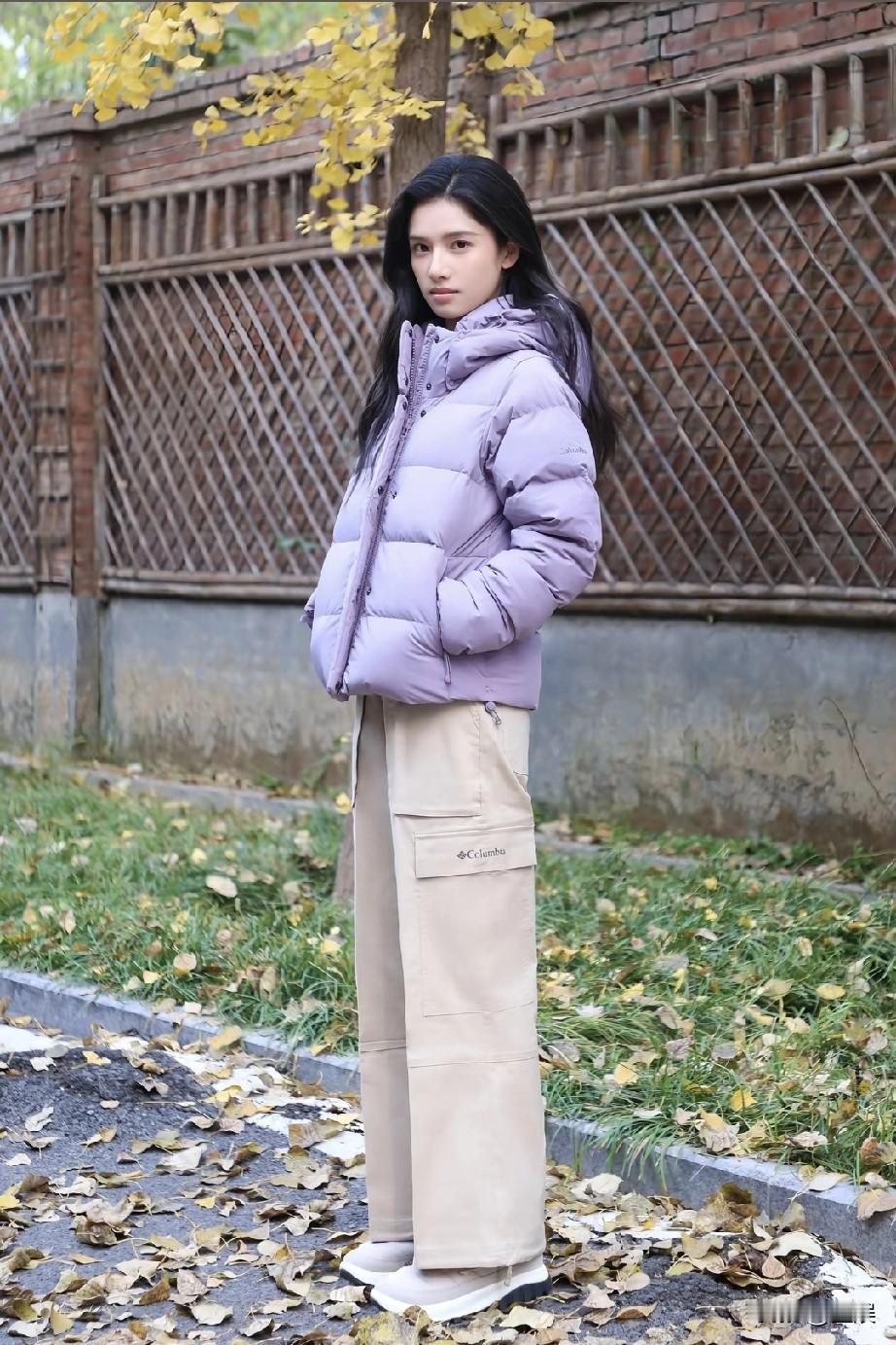 张婧仪的冬日穿搭有氛围感啦! 浅紫色的Columbia短款羽绒服,搭配卡其色工装裤,简约,在落叶与青草交织的季节里,尽显温柔的气质,原相机下的livephoto也把这份冬日美好完美定格