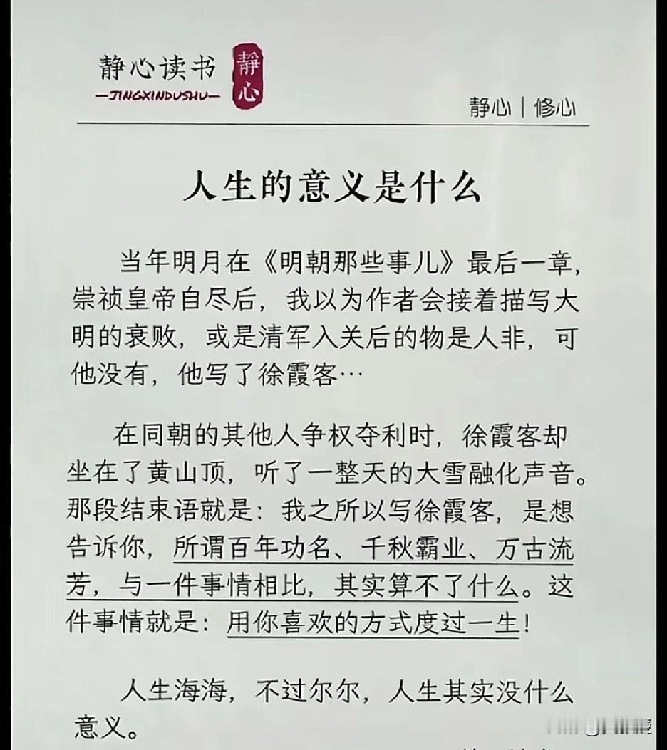 每个人时常都想人生的意义 有人为了钱,有人为了权 有人为了钱和权 时常迷失自己,包括我自己也时常迷茫 看过太多的人起高楼,宴宾客,楼塌了 人生海海,不过尔尔 开心健康,快乐,其实就足够幸福 祝福大家心想事成 同时也要有平和心态,别把自己想的那么重要,没有谁,地球一样都转 平常心,得之你幸,不得你命 如此而已,学会和自己和解