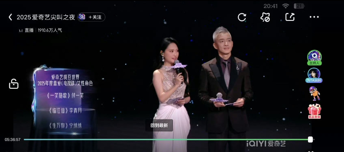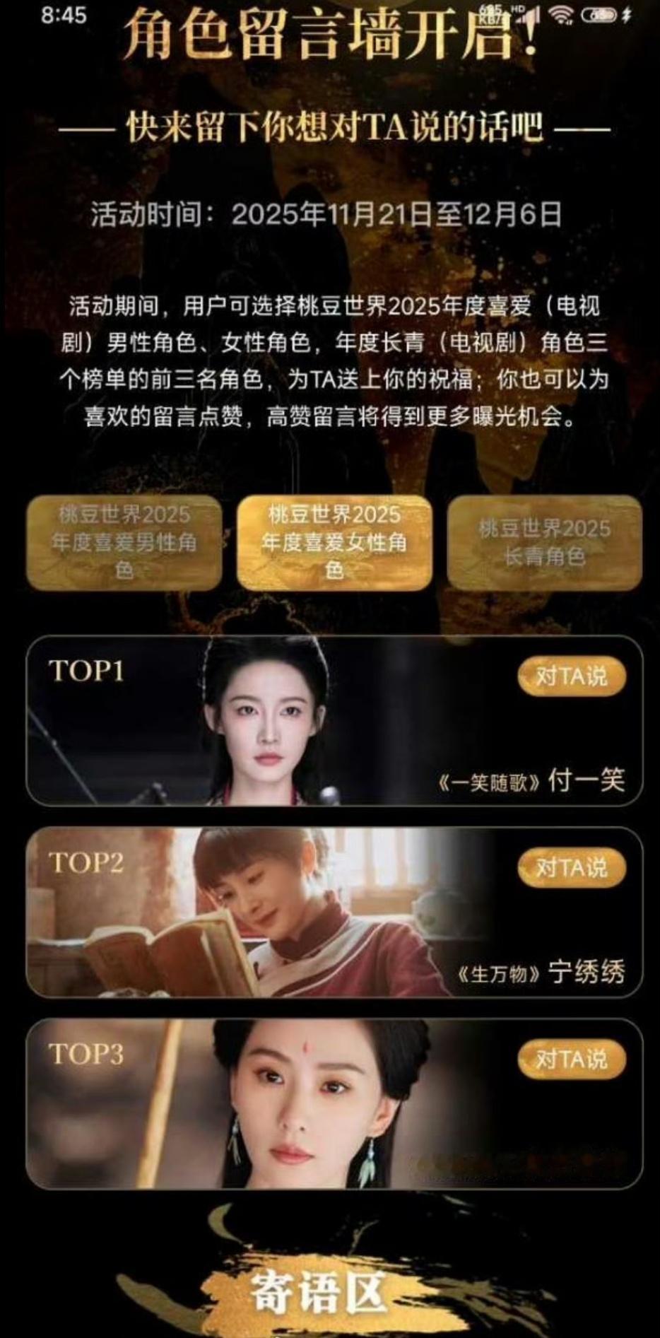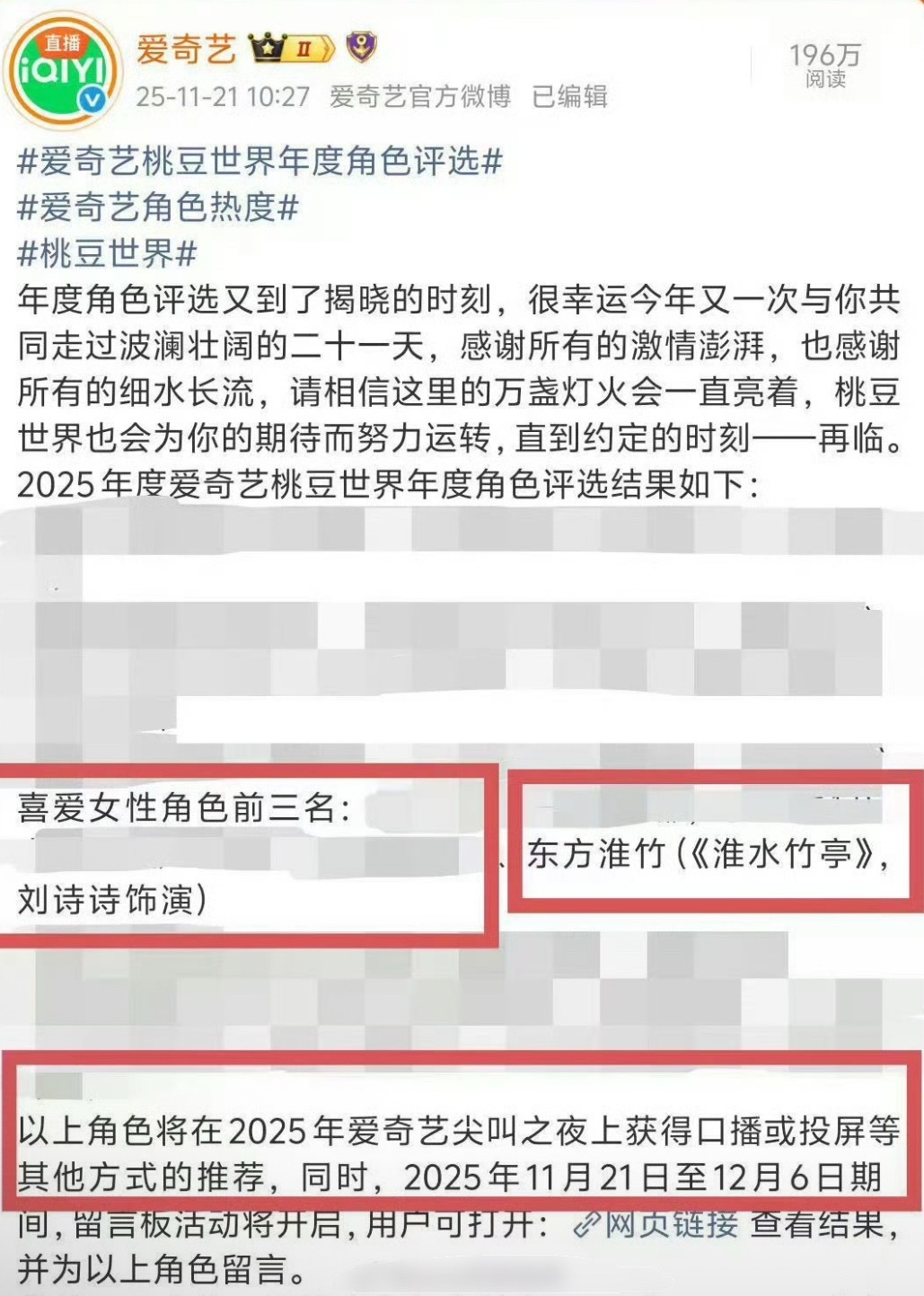刘诗诗的桃豆2025喜爱角色没有了,爱奇艺今晚没提。