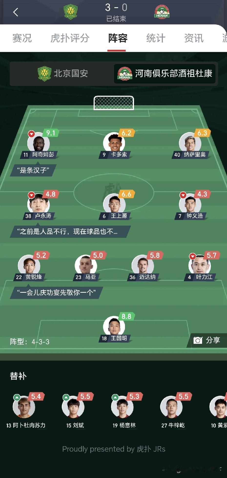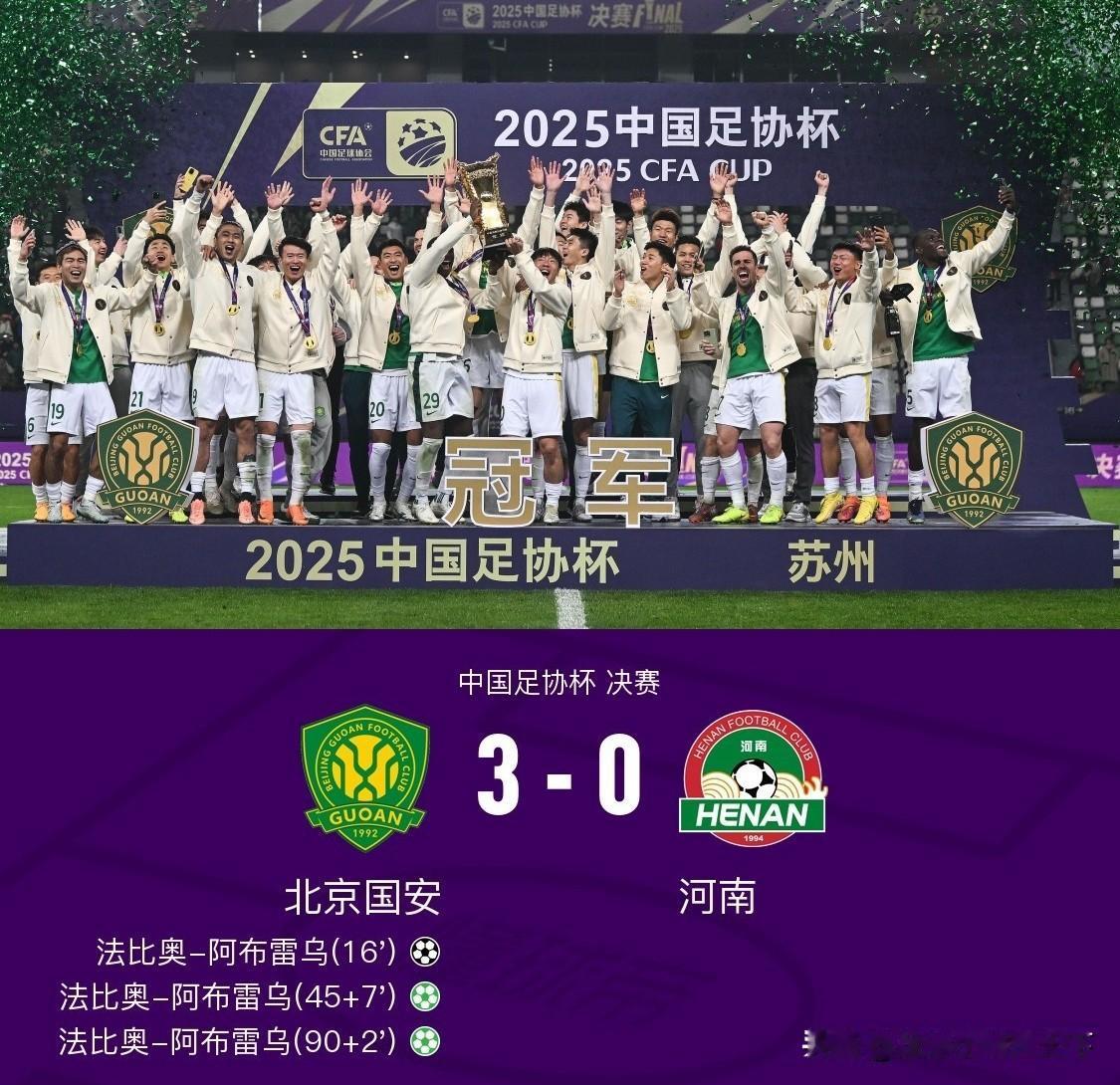恭喜国安夺冠,年年说争冠,今年终于实现了,期望国安明年去亚冠能为中超争口气! 这场足协杯决赛国安赢的没话说,战术得当,稳扎稳打,反击犀利,实力也更胜一筹。 反观河南队赛前有点摆不清位置了,一上来就和国安打对攻,真拿自己当强队了?之前连着两场客场点球大战淘汰申花和成都是靠什么战术没点数吗? 其实河南队如果把自己放在弱者心态打反击,每个队都不好打他,今天这场如果继续稳个平局拖到点球大战还能有赢得希望,可惜今天主教练战术安排失误,被国安用低调务实的打法赢了比赛。或许这就是河南队成功路上要交的学费吧!