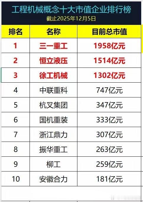工程机械概念十大市值企业排行榜!1 、三一重工:目前总市值 1958亿元 2 、恒立液压:目前总市值 1514亿元 3 、徐工机械:目前总市值 1302亿元 4 、中联重科:目前总市值 747亿元5、 杭叉集团:目前总市值 347亿元 6、 国机重装:目前总市值 333亿元 7、 浙江鼎力:目前总市值 307亿元 8、 振华重工:目前总市值 263亿元 9、 柳工:目前总市值 259亿元 10、 安徽合力:目前总市值 181亿元