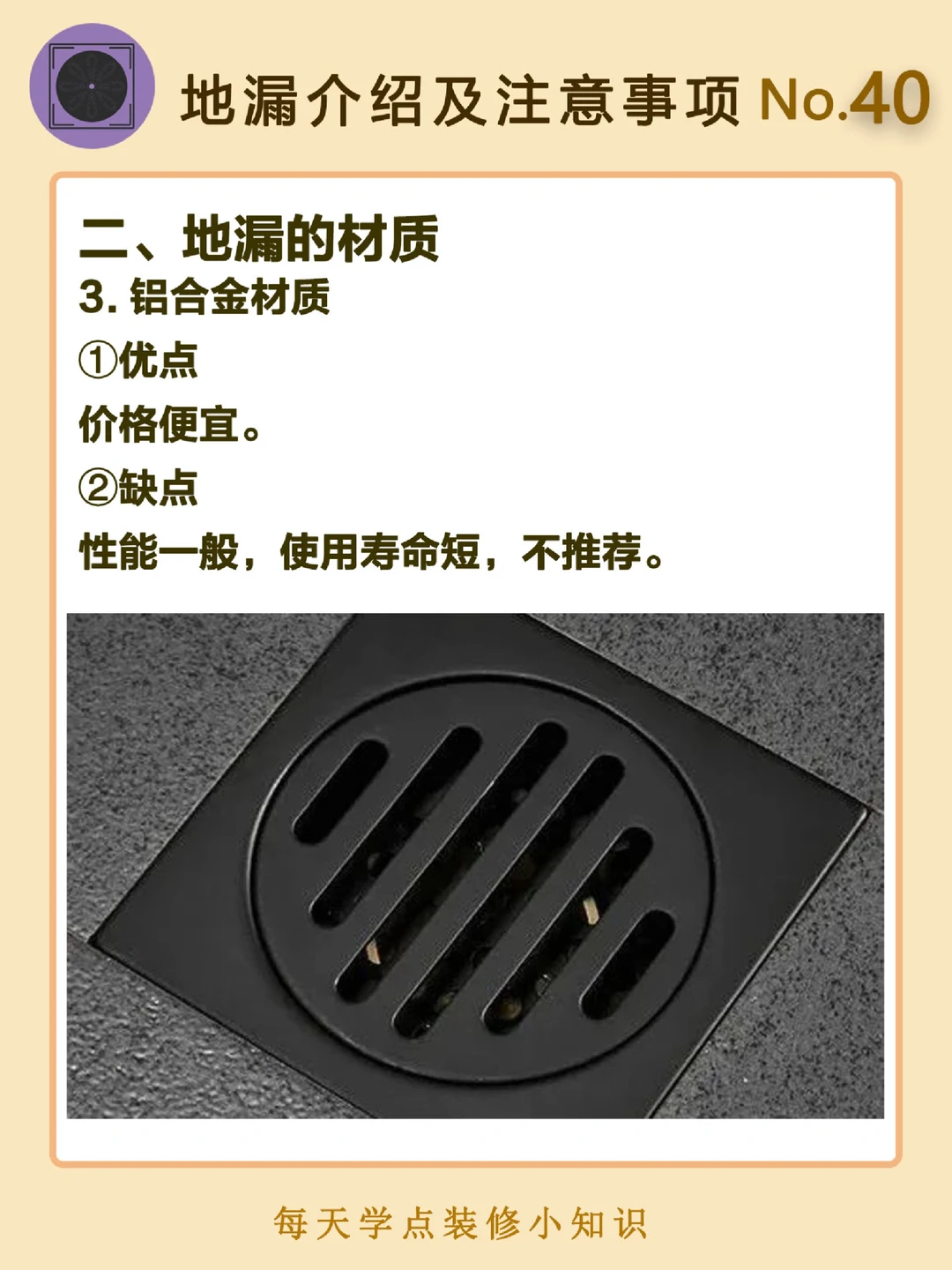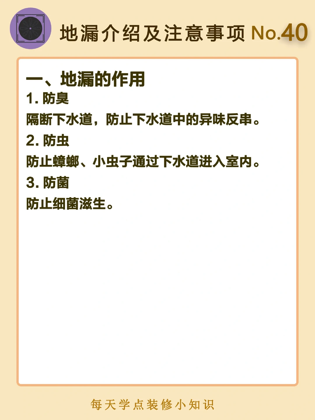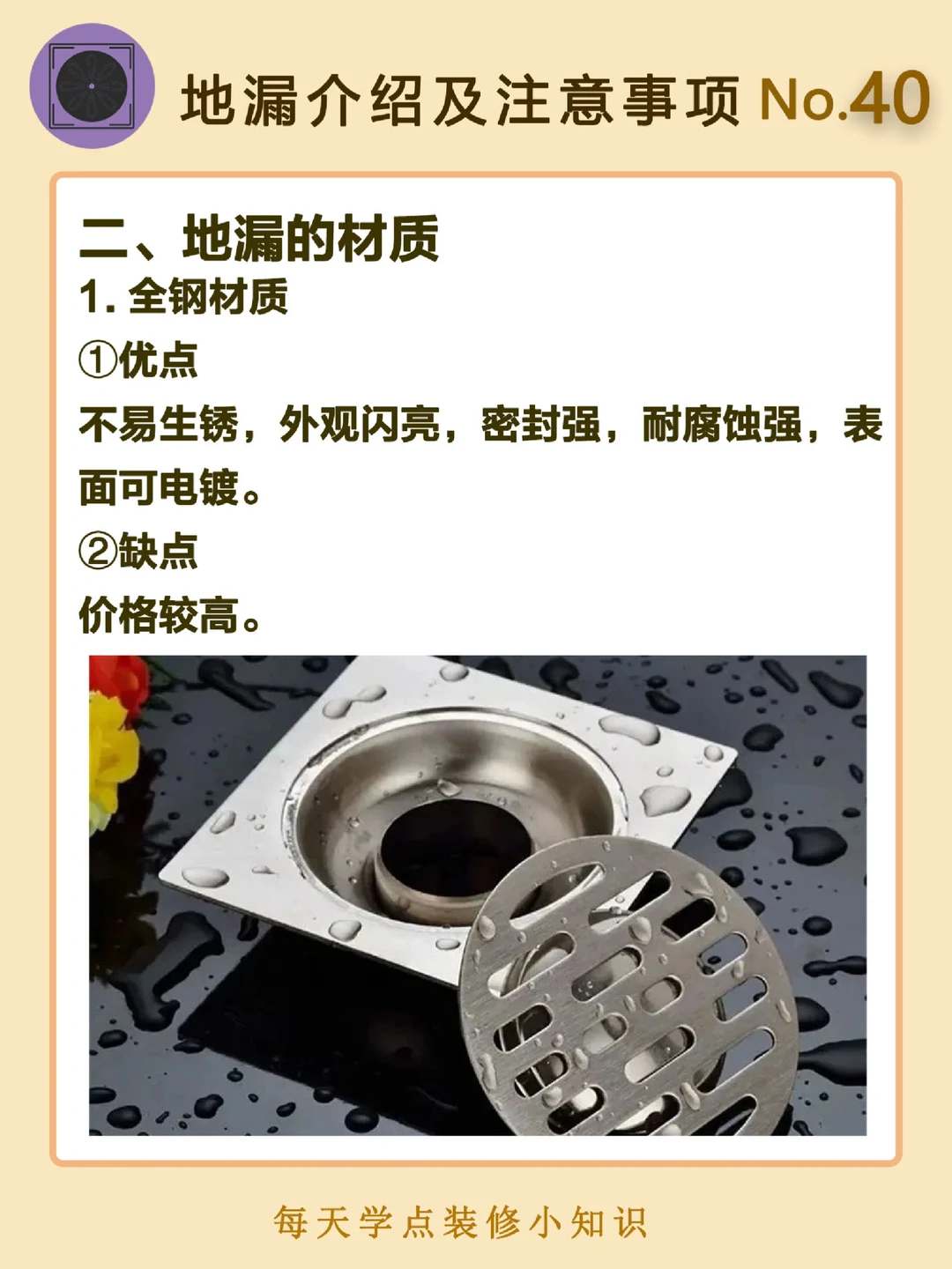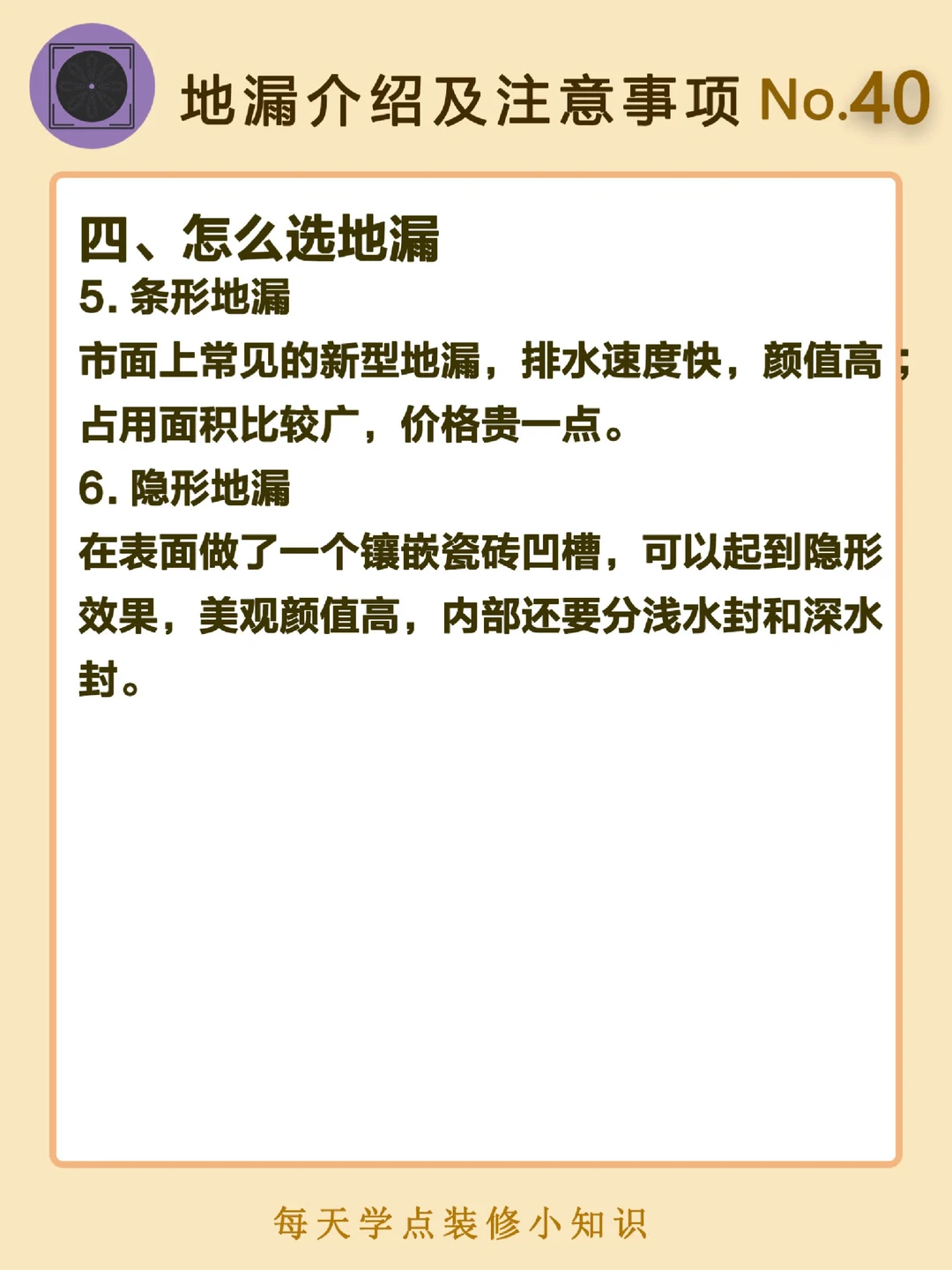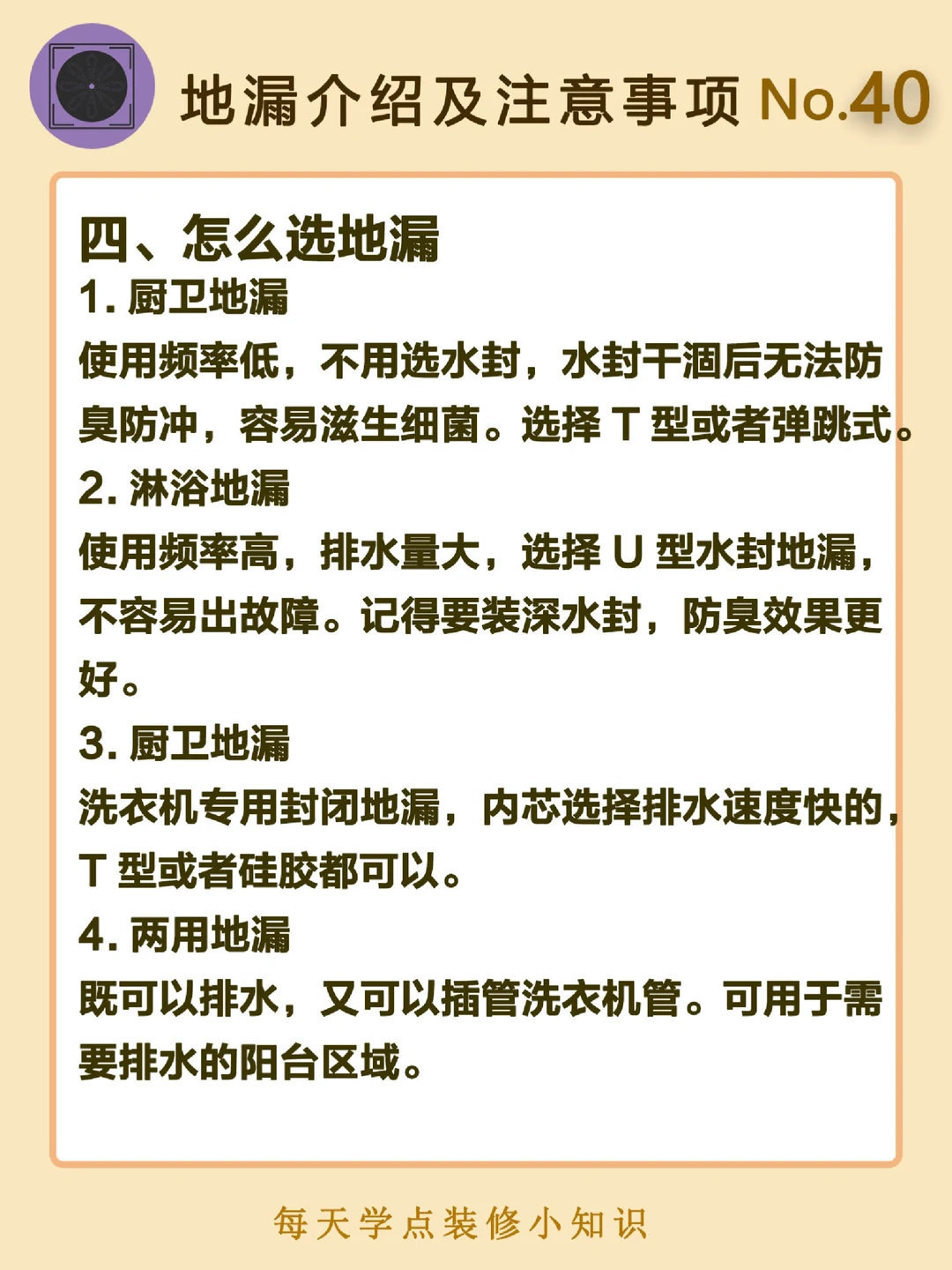 使用频率高,排水量大,选择U型水封地漏,不容易出故障。记得要装深水封,防臭效果更好。
