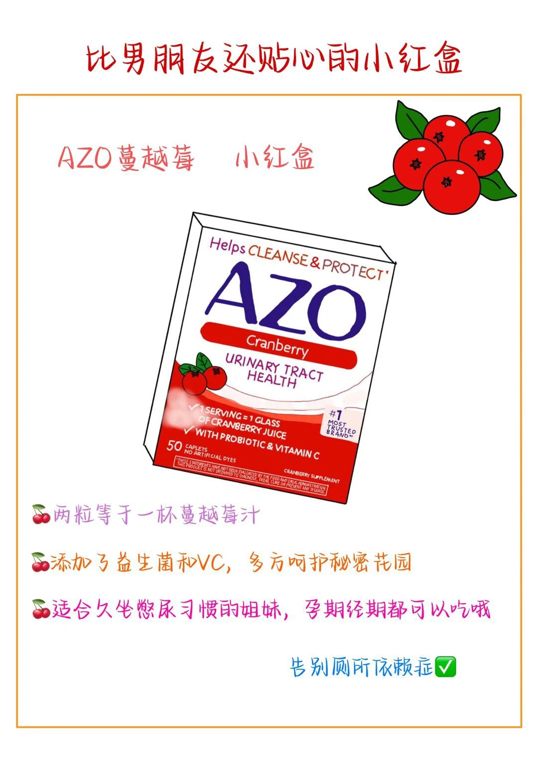 ❤️AZO是北美女性常选的私护品牌,里面的蔓越莓成分很温和,经期预期哺乳期也不用担心。相比别的品牌,他们家是PACran专利蔓越莓成分,每天两颗相当于25000mg蔓越莓新鲜果实,日常啃水果可达不到这样的量[赞R],适合办公室姐妹,经常憋尿的打工人,告别厕所依赖症[偷笑R][偷笑R][偷笑R]