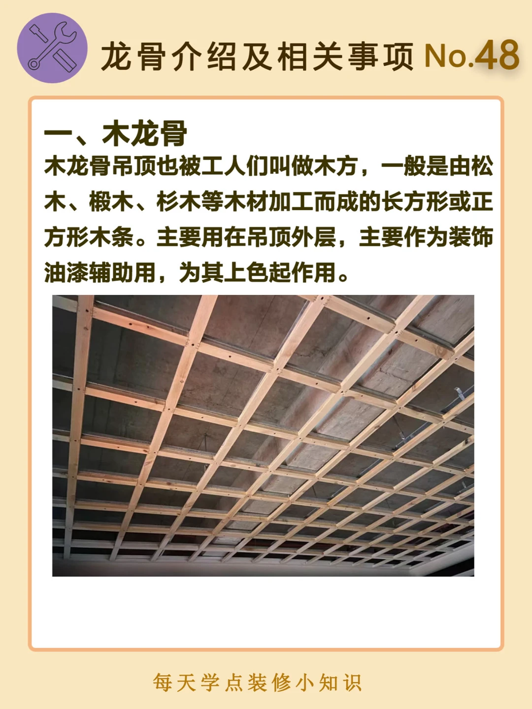 木龙骨吊顶也被工人们叫做木方,一般是由松木、椴木、杉木等木材加工而成的长方形或正方形木条。主要用在吊顶外层,主要作为装饰油漆辅助用,为其上色起作用。