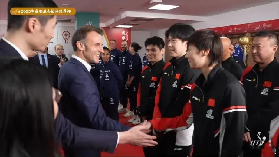 马克龙王曼昱握手照,国乒名将尽显大国自信马克龙在成都的最后一场公开活动选在了成都体育馆,专门和参加ITTF混团世界杯的中法乒乓球队交流。当天,在中国乒协负责人王励勤的引导下,马克龙先和中国队员逐个握手。林诗栋、王楚钦、王曼昱、孙颖莎排成一排,依次和他互动。之后马克龙还拿起球拍,搭档法国选手菲利克斯·勒布伦、帕瓦德,分别和林诗栋/王楚钦、孙颖莎/王楚钦组合对打。他还特别喜欢孙颖莎的勾手发球,特意让孙颖莎多演示了几次。随后马克龙观看了表演赛,对阵双方是法国的菲利克斯·勒布伦/帕瓦德和中国的王曼昱/林诗栋。赛场上的王曼昱尽显大将风范,几个回合打得又漂亮又从容,球技观赏性十足。表演赛结束后,马克龙对王曼昱十分认可,主动竖起大拇指,还上前和她握手。面对马克龙,王曼昱落落大方,不卑不亢地回应,眼神里满是自信,完美展现了中国奥运冠军的风采。这个握手瞬间被记者拍下后,直接被官方选为了封面照。照片曝光后,网友们纷纷点赞,认为王曼昱的表现特别提气,不仅展现了个人的沉稳气场,更传递出了大国自信——咱们国家培养的优秀运动员,面对大场面和大人物时,就该这样不怯场、端庄大气。