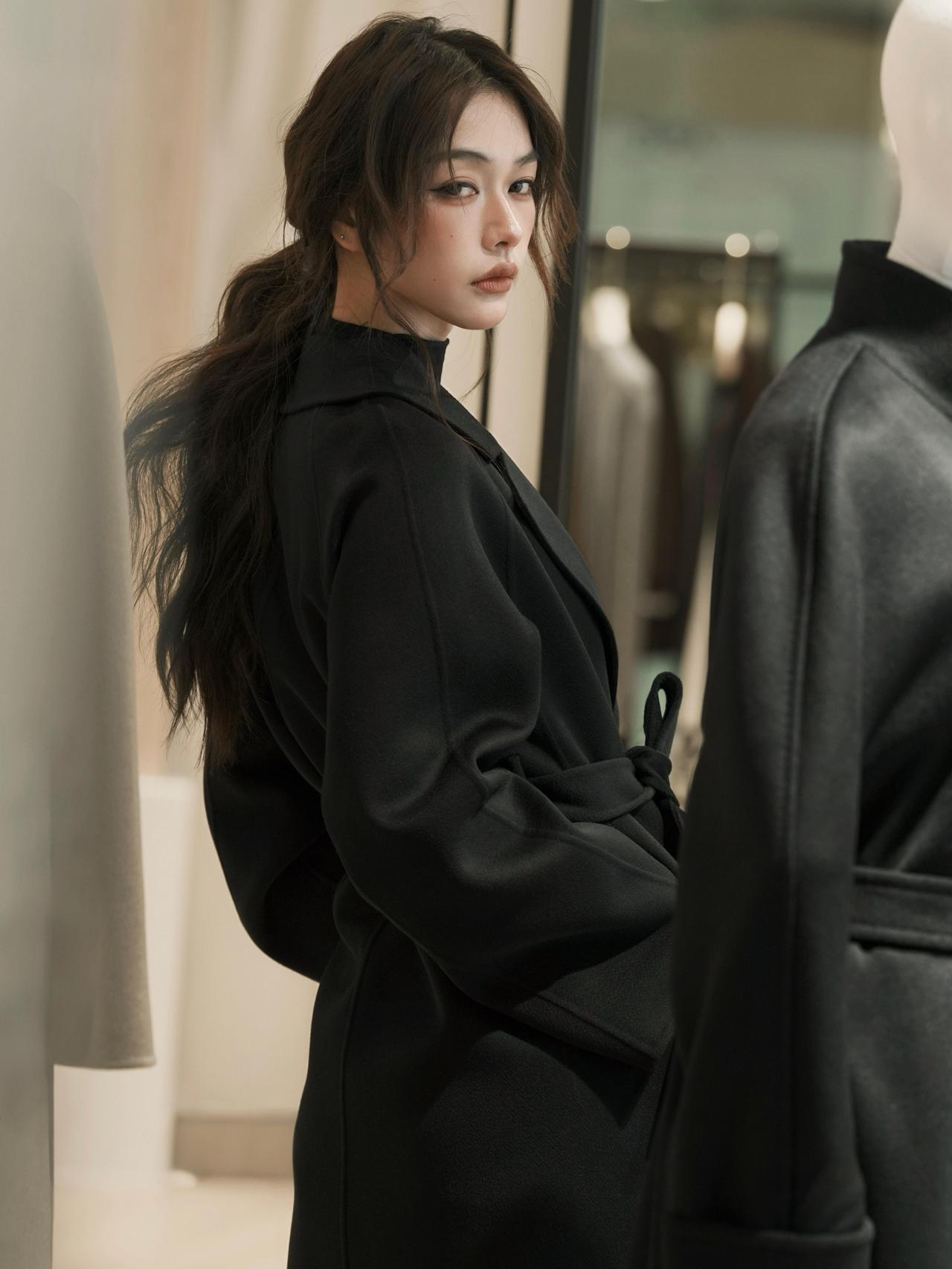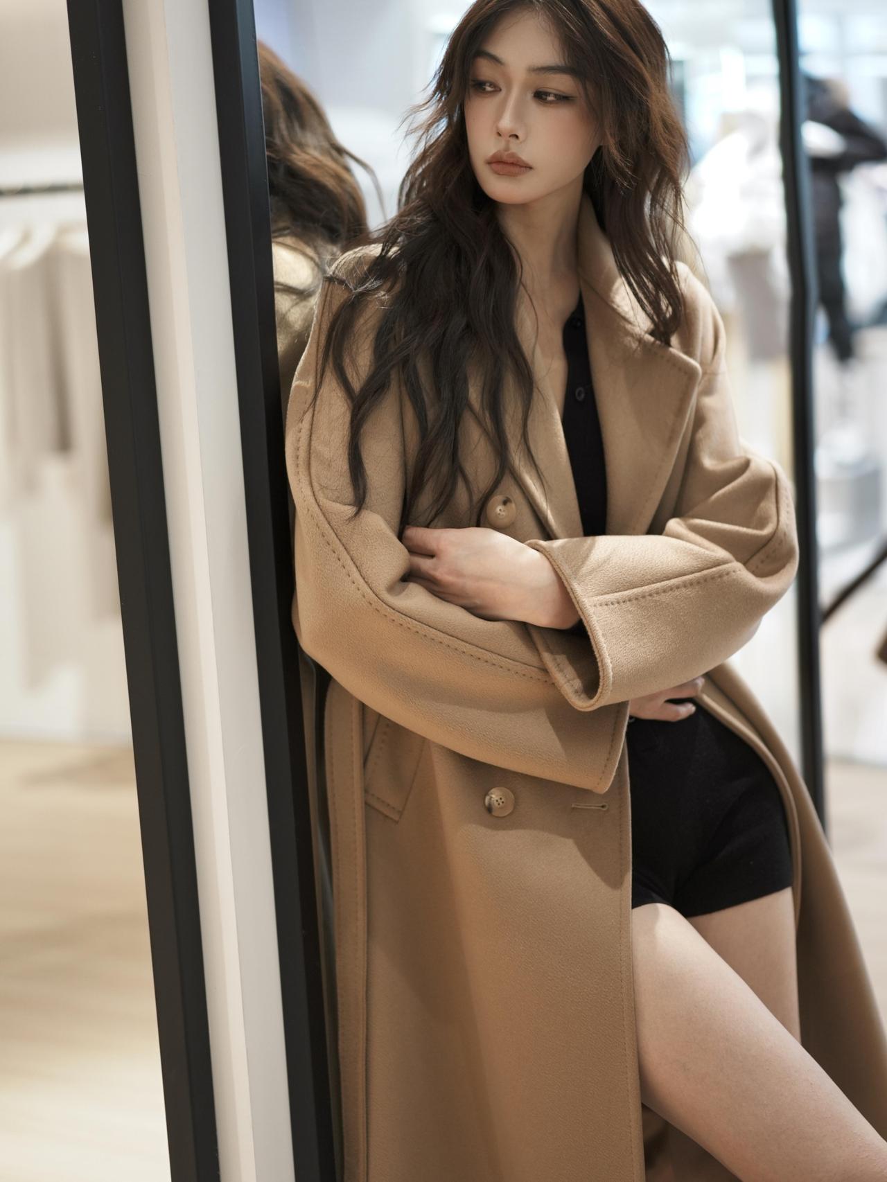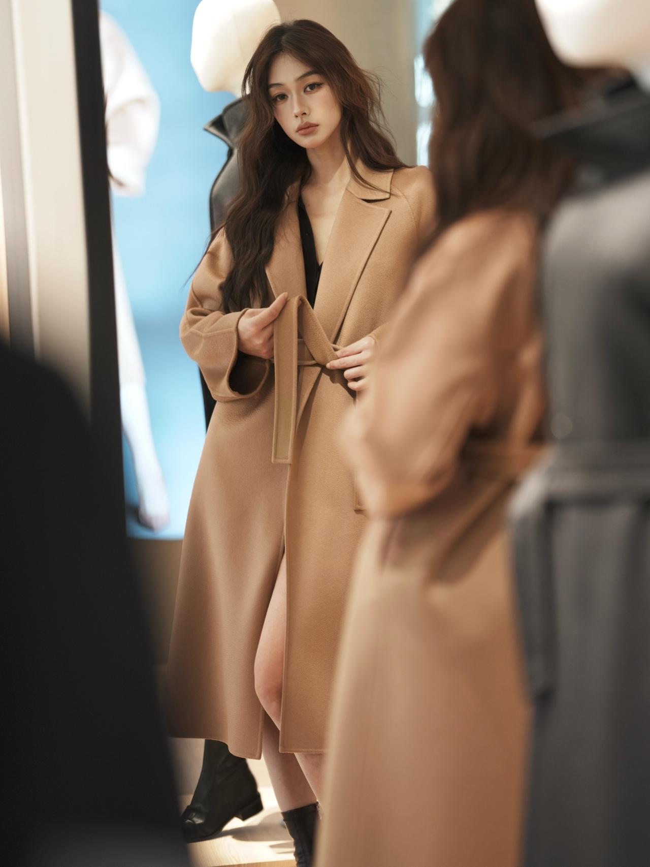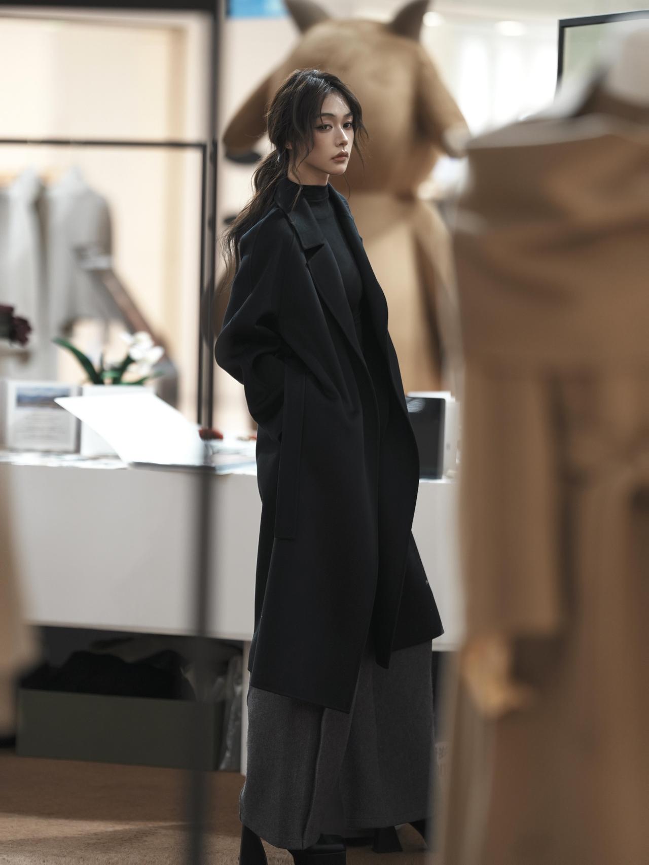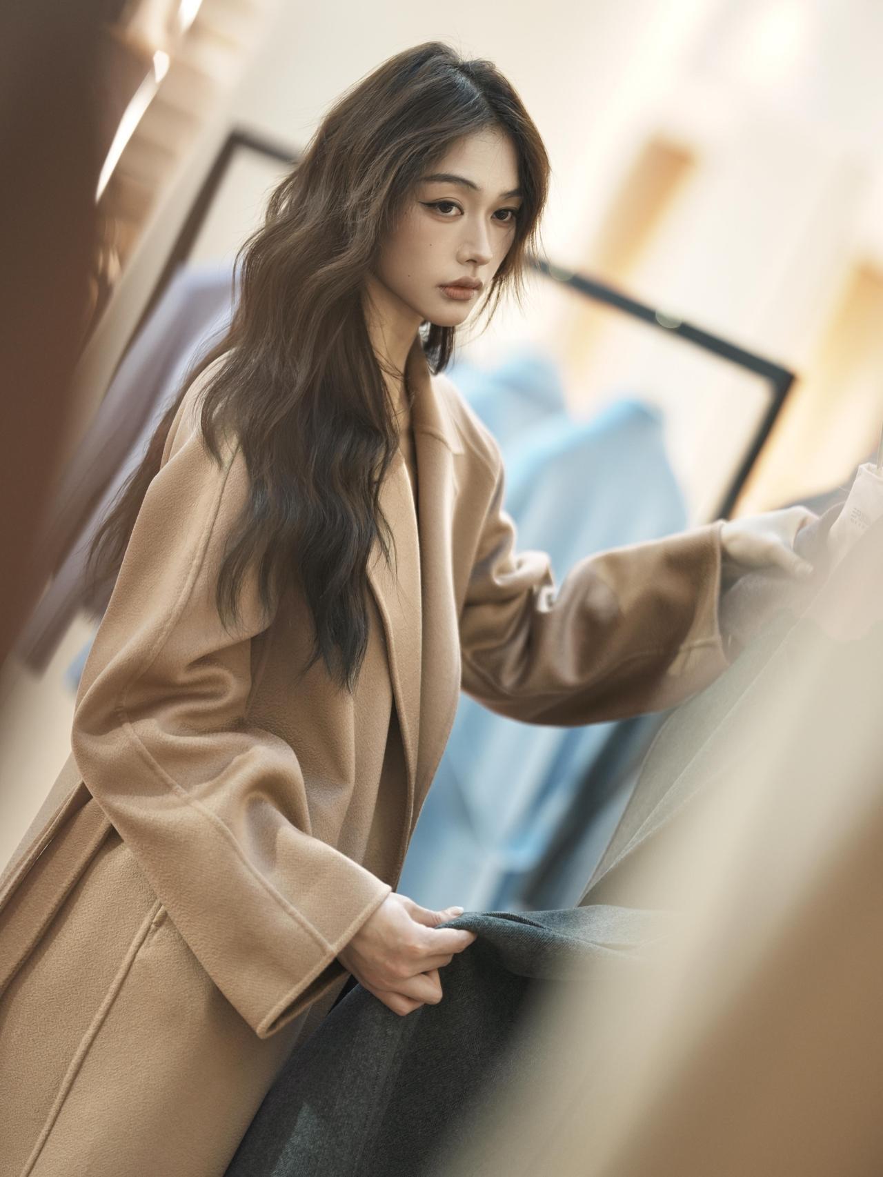 同元素的风格反差,黑大衣版本以“冷感锐利”为核心:高领内搭收紧线条,腰带强调腰线,配合背景暗调与人物冷艳神态,塑造出都市女性的干练形象;而驼色大衣版本则以“温柔舒展”为基调:宽松版型、露肤内搭与随意翻折的袖口,搭配暖调光线,传递出慵懒优雅的气质。
