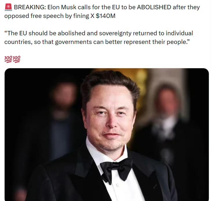 埃隆·马斯克呼吁解散欧盟:“欧盟应该被废除,主权应当归还给各个国家,这样各国政府才能更好地代表自己的人民。”