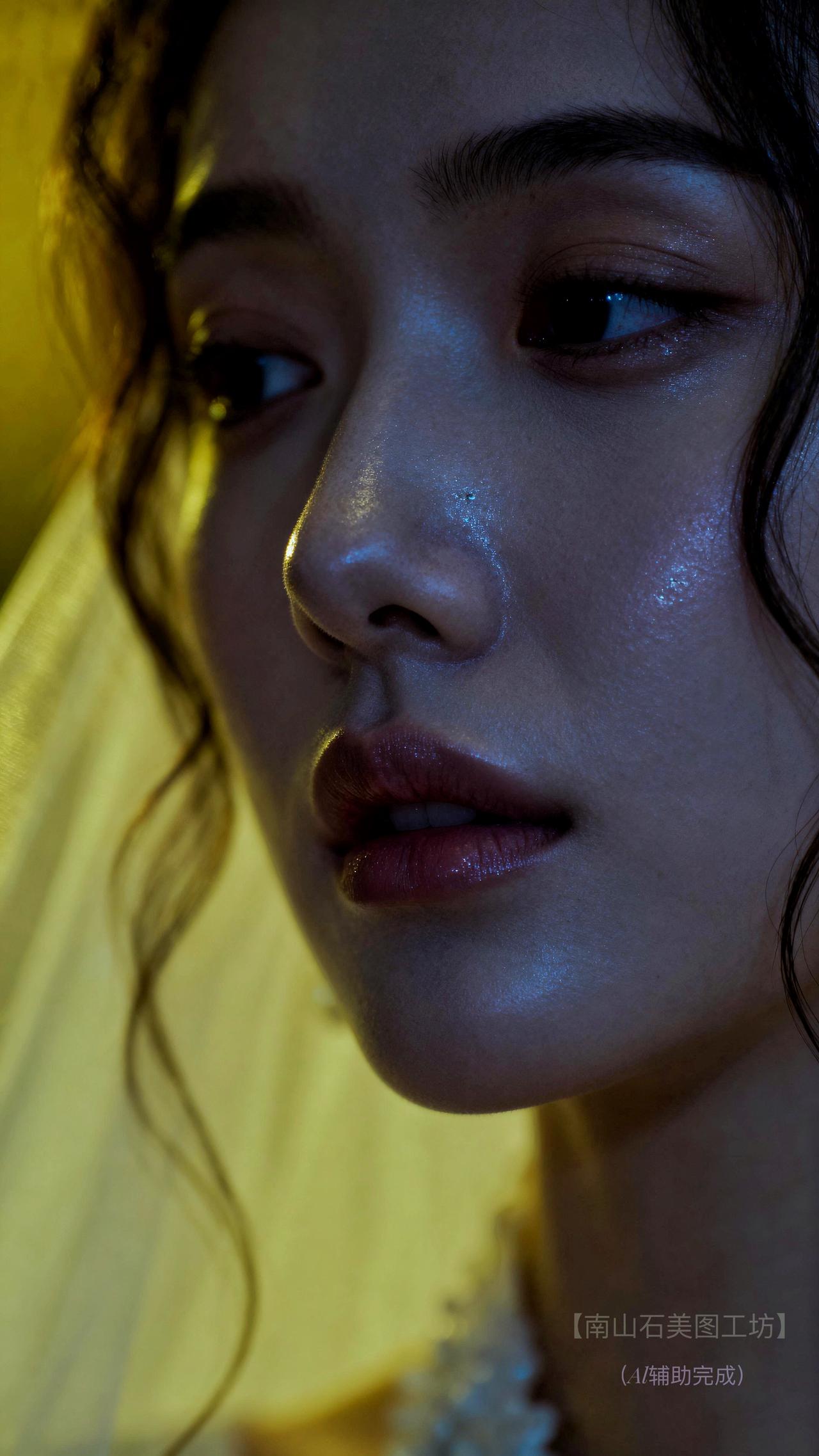 暖金光缕缠绕卷发,婚纱薄纱晕开朦胧诗境。眉若黛山,眼藏星浪,唇畔温柔似有若无。光影在瓷肌谱优雅乐章,每寸轮廓熔铸高贵与柔美,这侧颜,是现实里开出的梦幻花。
