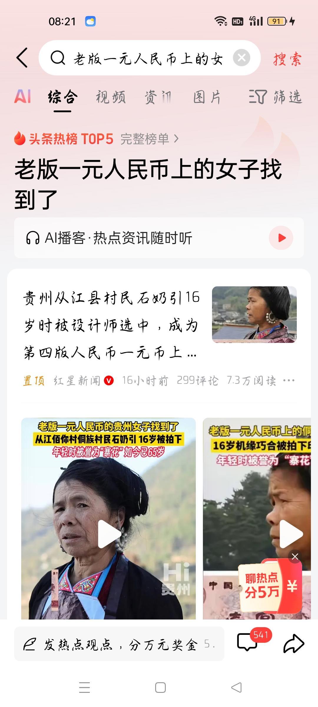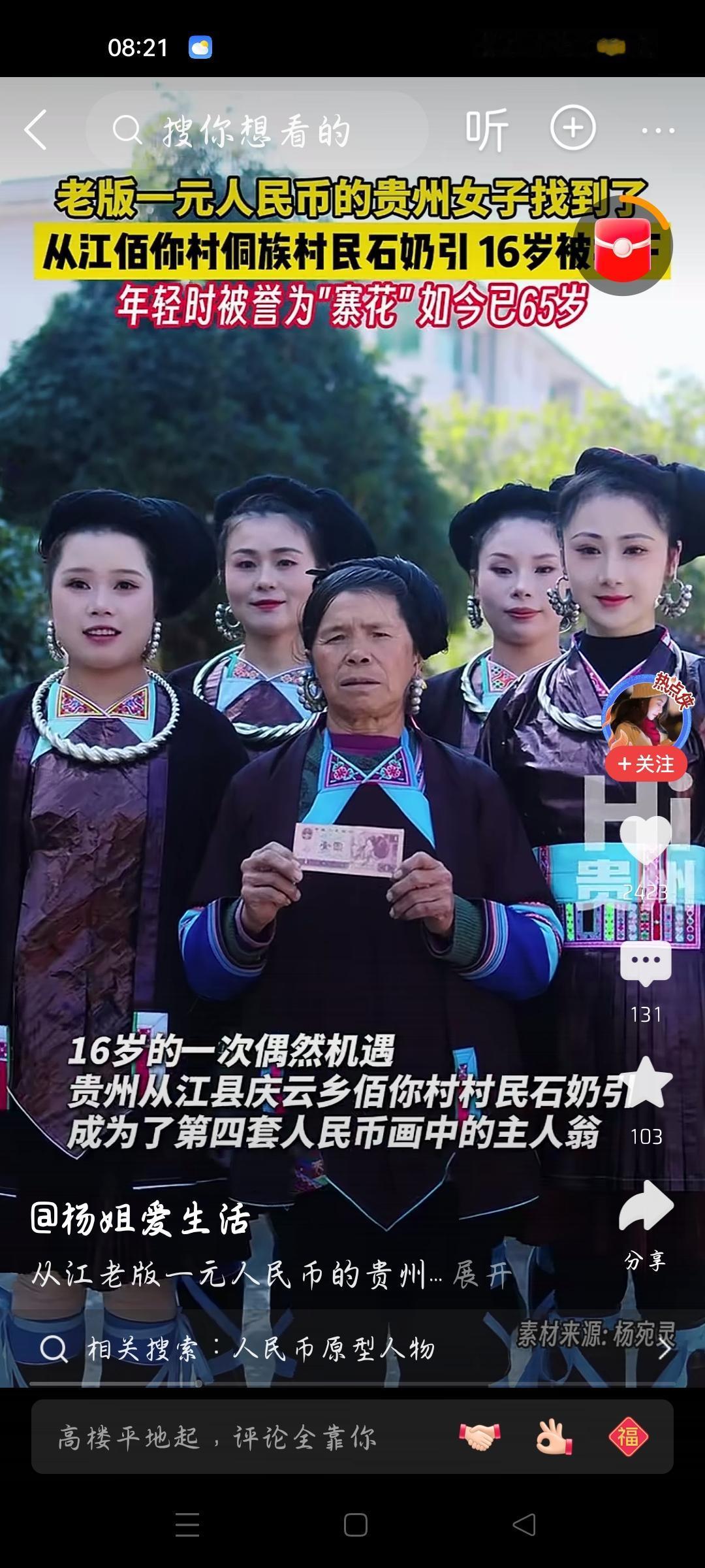 老版一元人民币上的女子找到了,我想说 据红星新闻报道,贵州从江县村民石奶引16岁被设计师选中,成为第四版人民币上的女子,石奶引是侗族人,16岁去赶集时被第四版人民而的设计师侯一民老师发现,她的少女气息和侗族服装吸引了设计师,机缘巧合成为了第四版一元人民币的侗族头像,想当初,石奶引是寨花,岁月磨去了她的青春,现在的她已经65岁,已经是一个老太太了,从视频来看,后面不知道是否她的孙辈?孙辈遗传了她的美丽基因,时代不同,如果是在现代,她是妥妥的网红了。各位条友觉得呢?