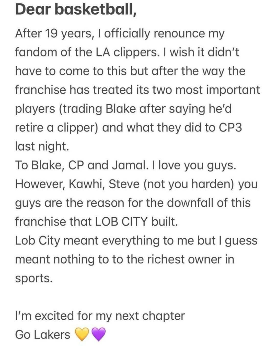 快船赶走了保罗,让一位叫Jimmy Reynolds的快船球迷伤透了心并选择成为了湖人球迷,喜欢快船19年的他在社交媒体上说:我正式宣布不再是这支球队的球迷。我本不希望事情发展到这一步,但在看到球队对待其两位最重要球员的方式后(比如在承诺格里芬会以快船球员身份退役后却将他交易),以及他们对保罗的做法,我别无选择。然而,伦纳德和鲍尔默(哈登不算),你们是导致这个由“空接之城”建立起来的球队走向衰落的原因。“空接之城”对我意义重大,但对这位体育界最富有的老板来说似乎毫无意义。我对接下来的新篇章感到兴奋,湖人加油 💛💜格里芬在他社媒下方评论道:“去寻找你的平静吧。”