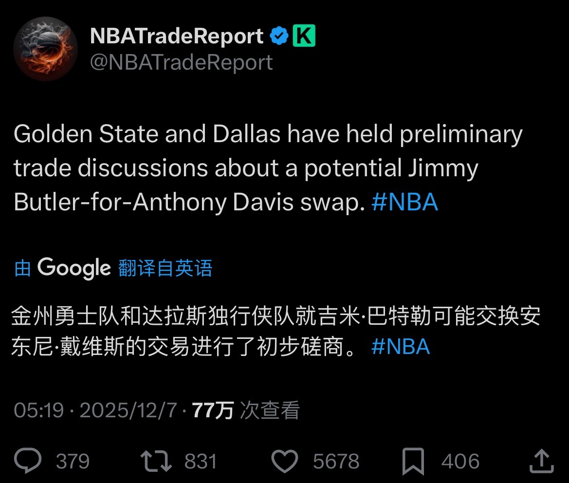 金州勇士队和达拉斯独行侠队就吉米·巴特勒可能交换安东尼·戴维斯的交易进行了初步磋商。勇士有意戴维斯勇士想用巴特勒交易来戴维斯