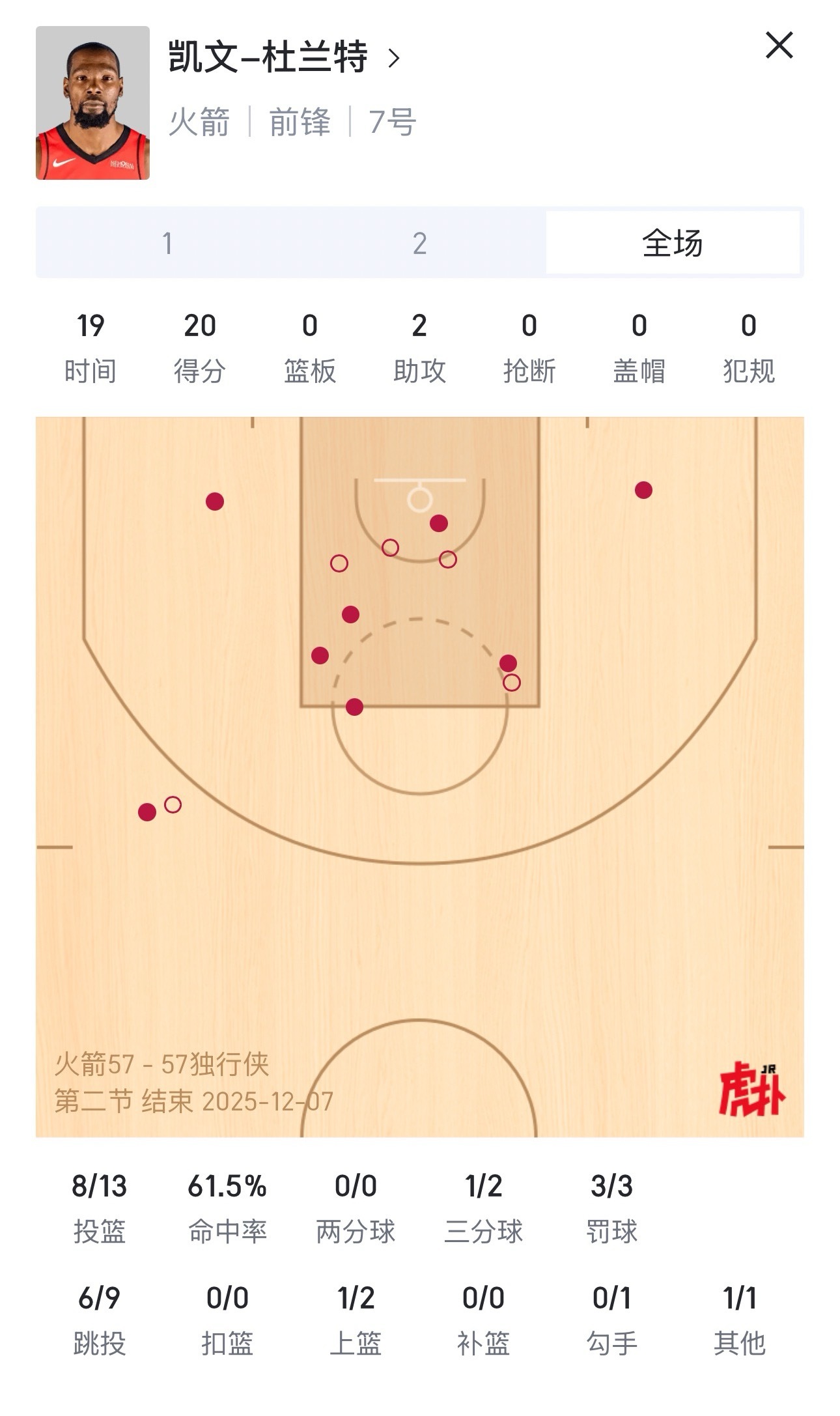 上半场结束,独行侠和火箭战成57平