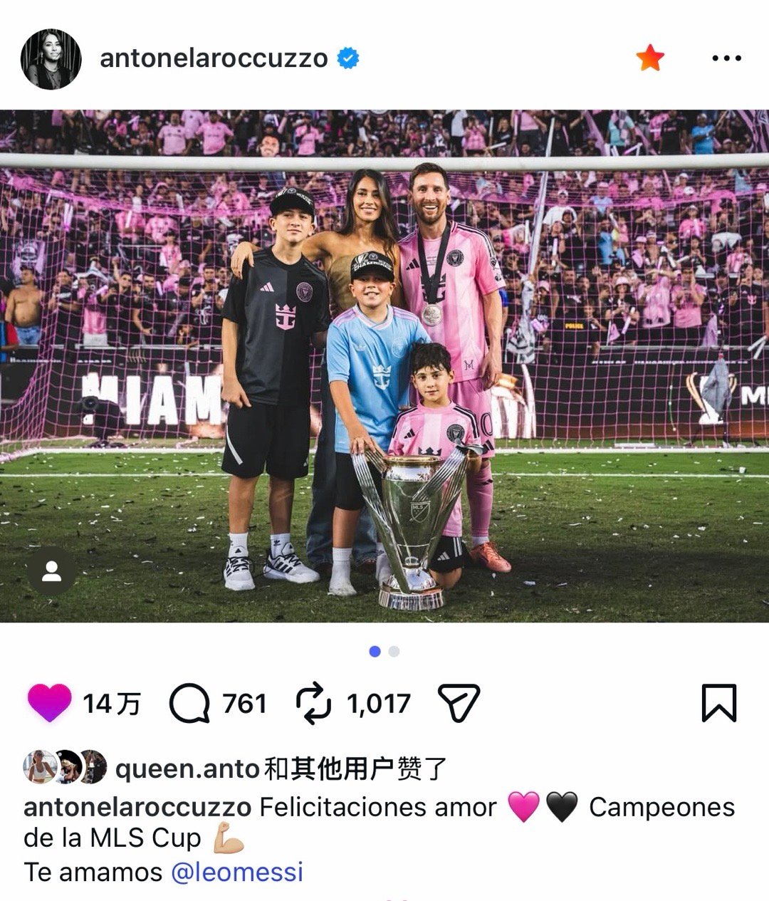 安妞更新ins|恭喜,亲爱的🩷🖤 MLS杯冠军💪🏼我们爱你